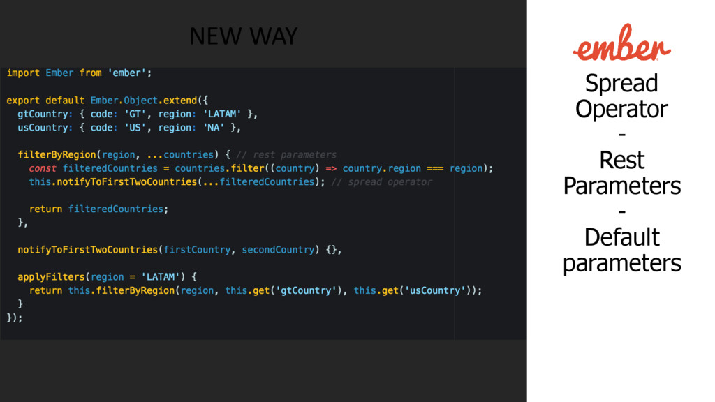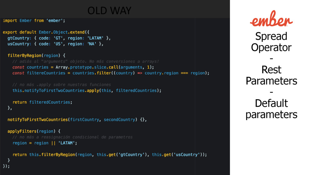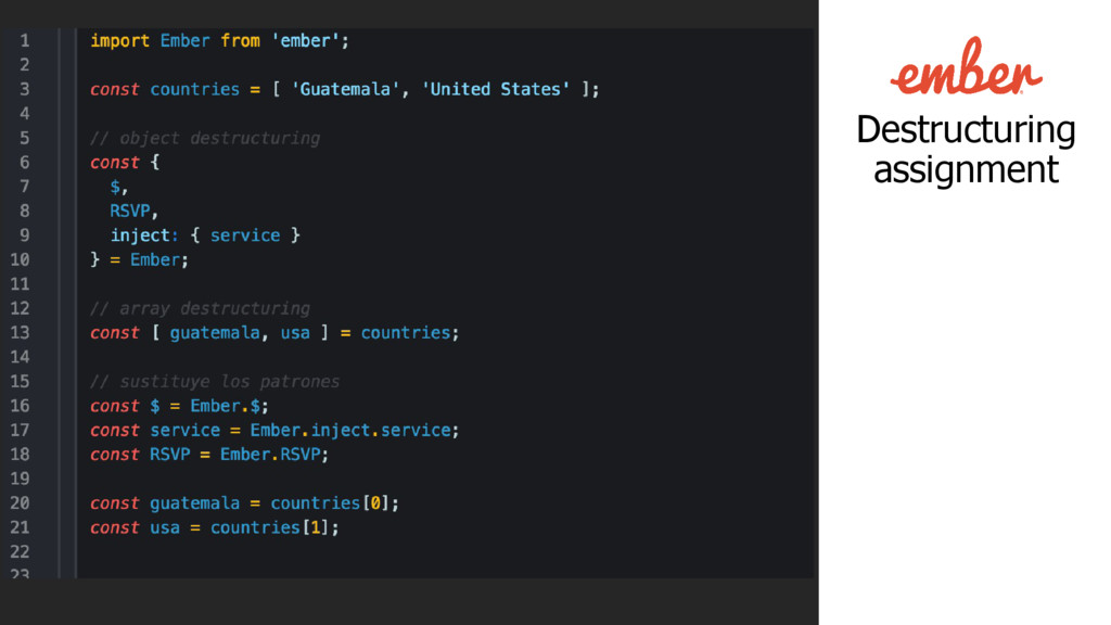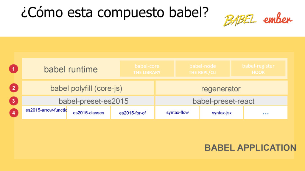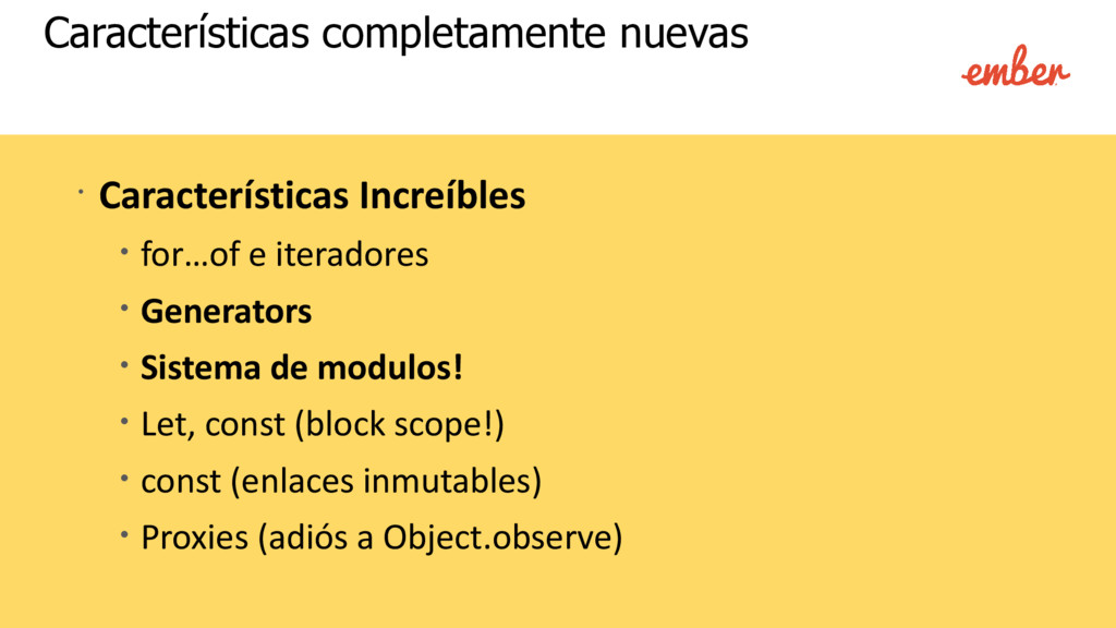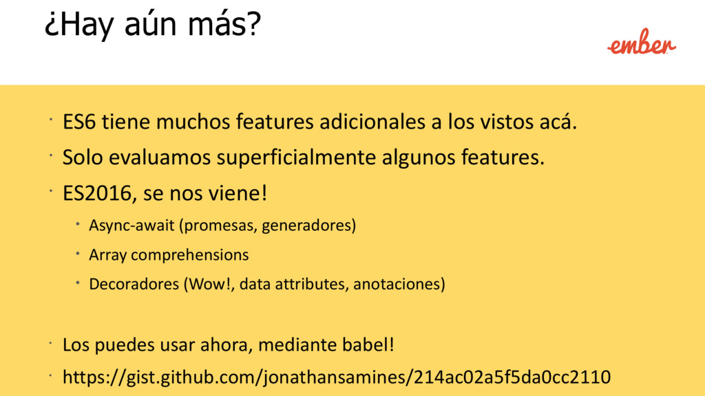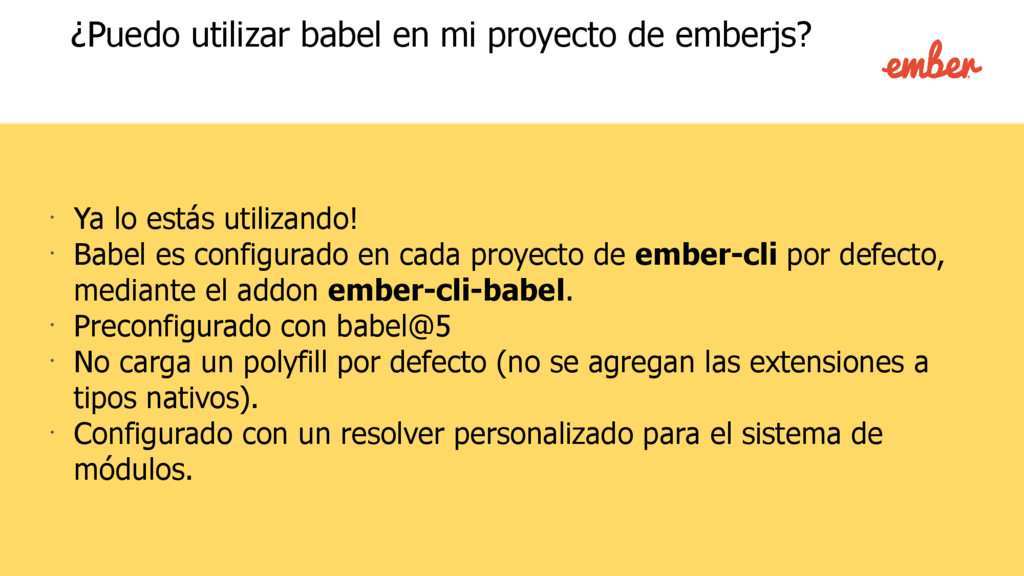 lo estás utilizando! • Babel es configurado en cada proyecto de ember-cli por defecto, mediante el addon ember-cli-babel. • Preconfigurado con babel@5 • No carga un polyfill por defecto (no se agregan las extensiones a tipos nativos). • Configurado con un resolver personalizado para el sistema de módulos.