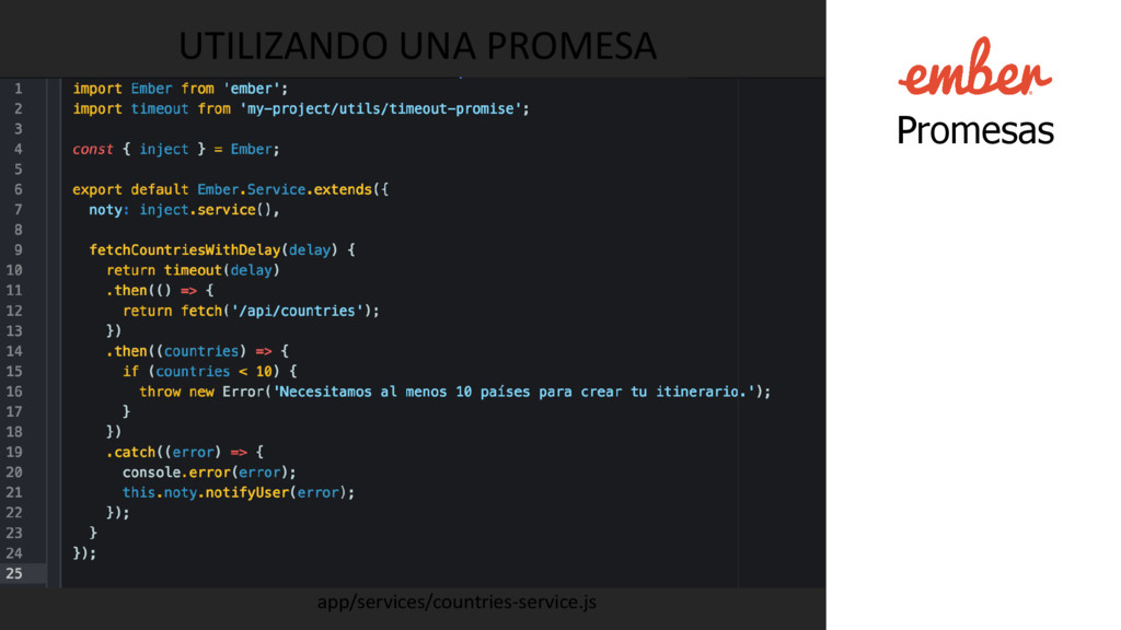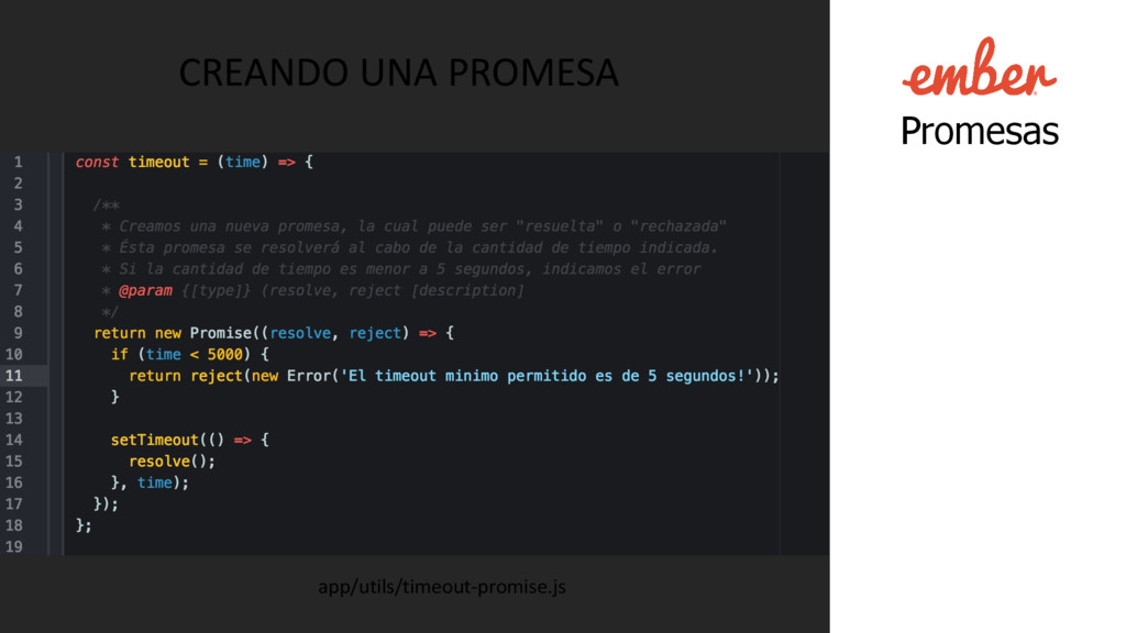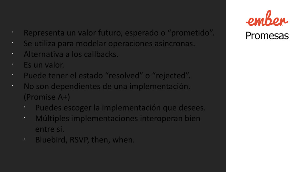 Se utiliza para modelar operaciones asíncronas. • Alternativa a los callbacks. • Es un valor. • Puede tener el estado “resolved” o “rejected”. • No son dependientes de una implementación. (Promise A+) • Puedes escoger la implementación que desees. • Múltiples implementaciones interoperan bien entre si. • Bluebird, RSVP, then, when.