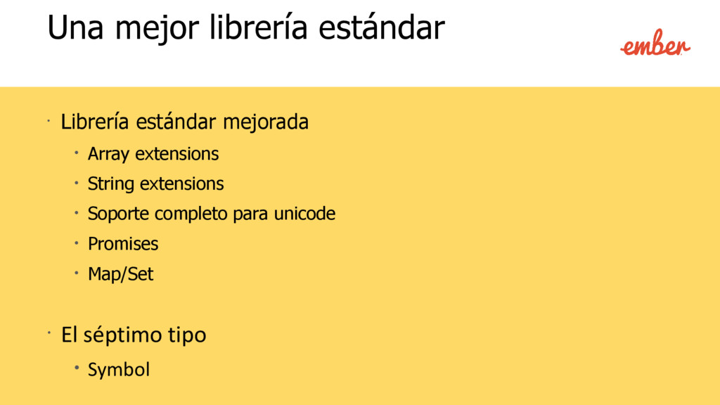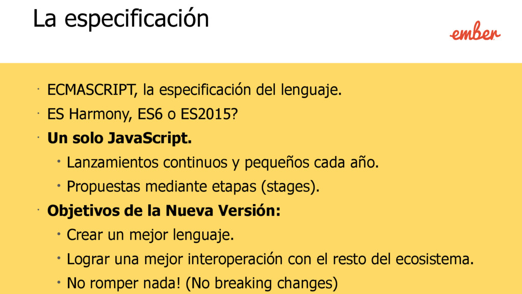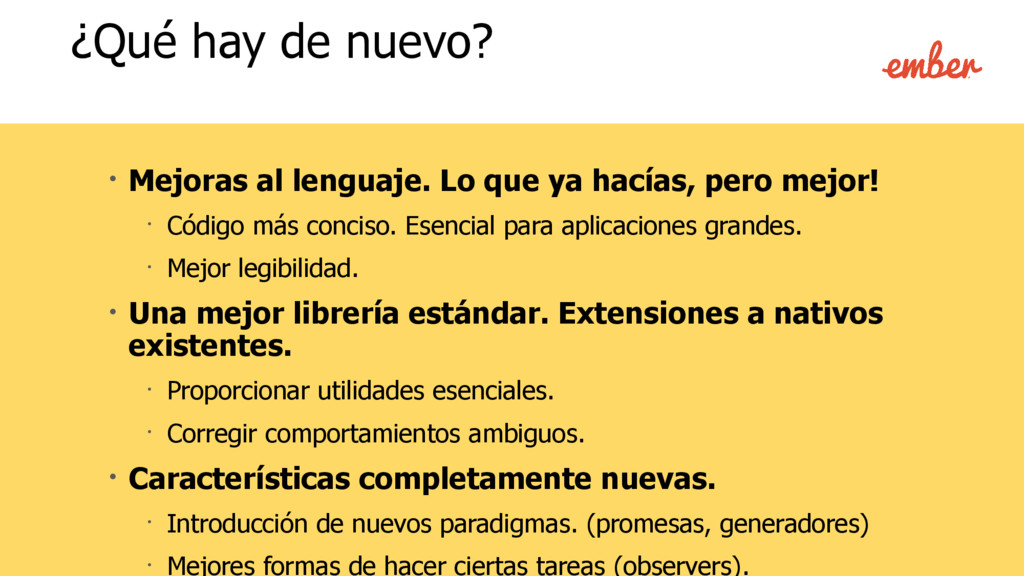 • Código más conciso. Esencial para aplicaciones grandes. • Mejor legibilidad. • Una mejor librería estándar. Extensiones a nativos existentes. • Proporcionar utilidades esenciales. • Corregir comportamientos ambiguos. • Características completamente nuevas. • Introducción de nuevos paradigmas. (promesas, generadores) • Mejores formas de hacer ciertas tareas (observers). ¿Qué hay de nuevo?