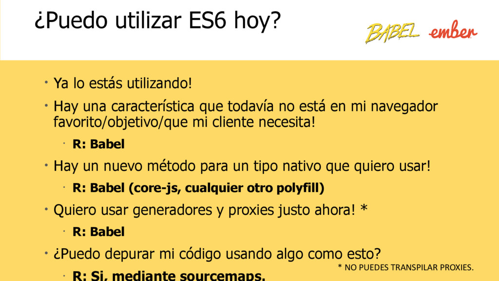 todavía no está en mi navegador favorito/objetivo/que mi cliente necesita! • R: Babel • Hay un nuevo método para un tipo nativo que quiero usar! • R: Babel (core-js, cualquier otro polyfill) • Quiero usar generadores y proxies justo ahora! * • R: Babel • ¿Puedo depurar mi código usando algo como esto? • R: Si, mediante sourcemaps. ¿Puedo utilizar ES6 hoy? * NO PUEDES TRANSPILAR PROXIES.