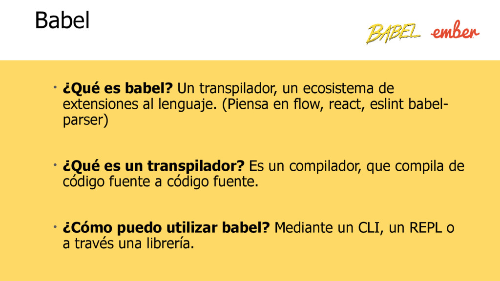 al lenguaje. (Piensa en flow, react, eslint babel- parser) • ¿Qué es un transpilador? Es un compilador, que compila de código fuente a código fuente. • ¿Cómo puedo utilizar babel? Mediante un CLI, un REPL o a través una librería. Babel