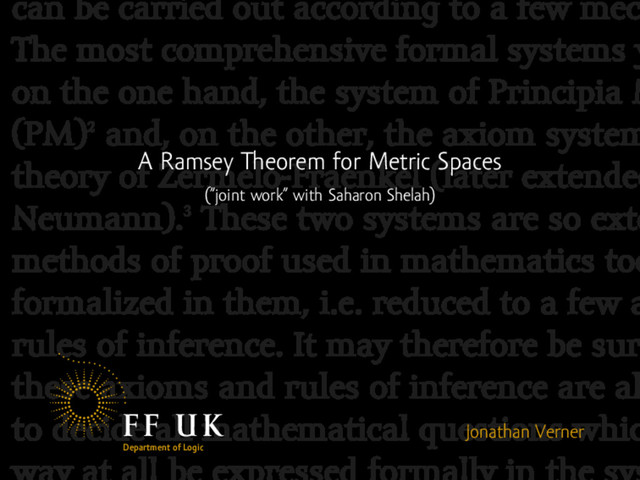 theorem Given a countable bounded metric space (X, ρ) we will find a metric space (Y, d) such that for any partition of Y into countably many pieces one piece contains a scaled isometric copy of X. ▶ By universality of Q ∩ [0, 1] we could only consider X = Q ∩ [0, 1]; this will not be needed. ▶ It is in fact sufficient to find a pseudometric (Y, ρ) space. ▶ Without loss of generality assume that the diameter of X is 1.