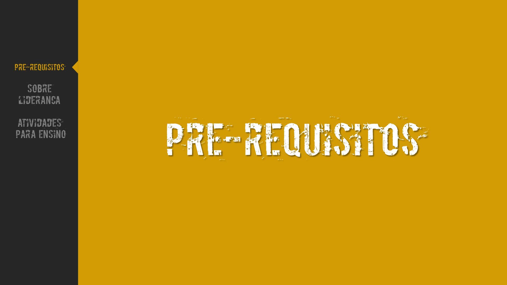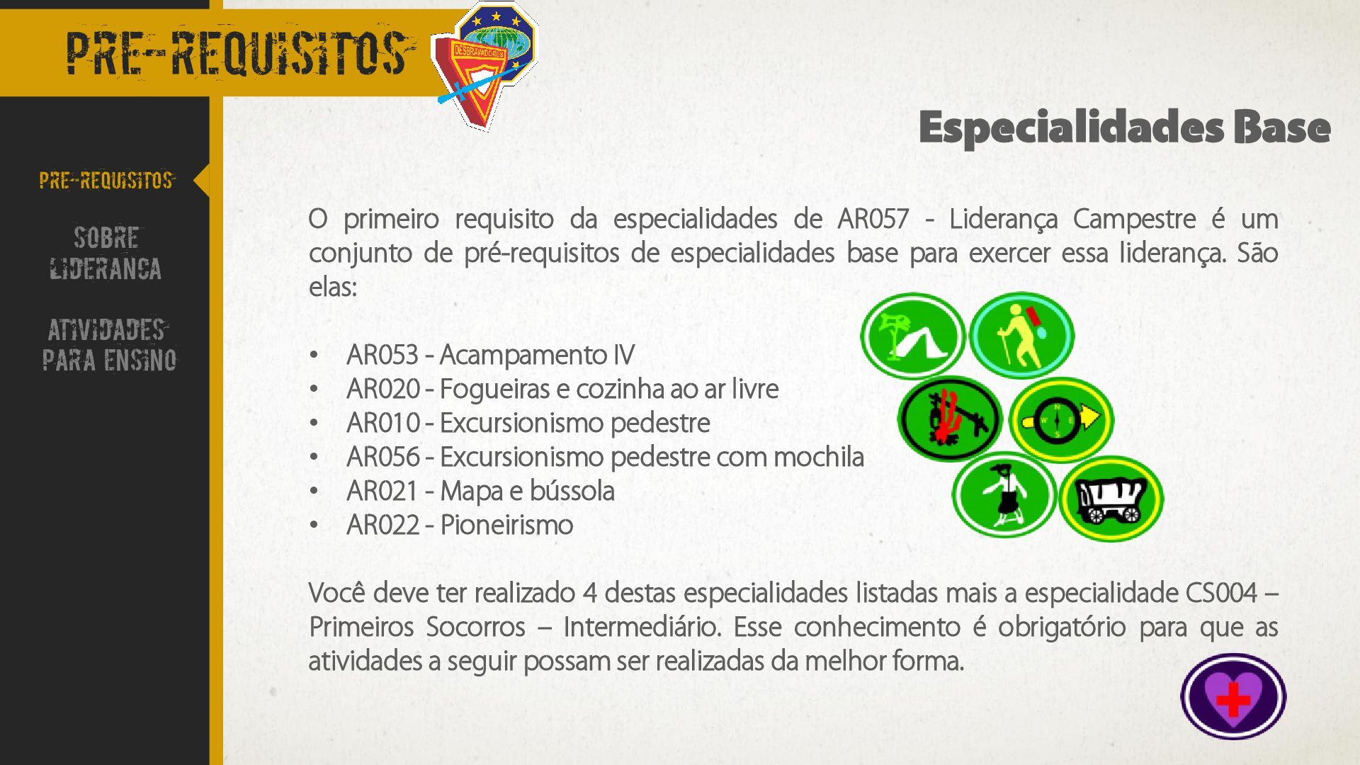 Campestre é um conjunto de pré-requisitos de especialidades base para exercer essa liderança. São elas: • AR053 - Acampamento IV • AR020 - Fogueiras e cozinha ao ar livre • AR010 - Excursionismo pedestre • AR056 - Excursionismo pedestre com mochila • AR021 - Mapa e bússola • AR022 - Pioneirismo Você deve ter realizado 4 destas especialidades listadas mais a especialidade CS004 – Primeiros Socorros – Intermediário. Esse conhecimento é obrigatório para que as atividades a seguir possam ser realizadas da melhor forma. Especialidades Base PRE-REQUISITOS SOBRE LIDERANCA ATIVIDADES PARA ENSINO