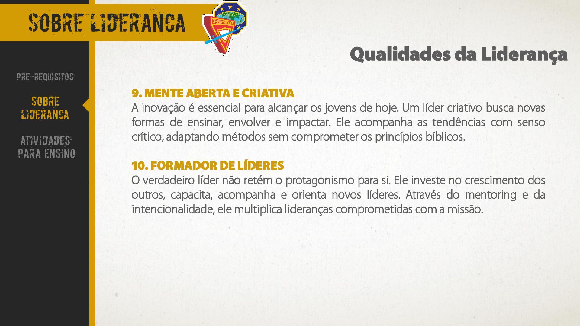 essencial para alcançar os jovens de hoje. Um líder criativo busca novas formas de ensinar, envolver e impactar. Ele acompanha as tendências com senso crítico, adaptando métodos sem comprometer os princípios bíblicos. 10. FORMADOR DE LÍDERES O verdadeiro líder não retém o protagonismo para si. Ele investe no crescimento dos outros, capacita, acompanha e orienta novos líderes. Através do mentoring e da intencionalidade, ele multiplica lideranças comprometidas com a missão. Qualidades da Liderança PRE-REQUISITOS SOBRE LIDERANCA ATIVIDADES PARA ENSINO
