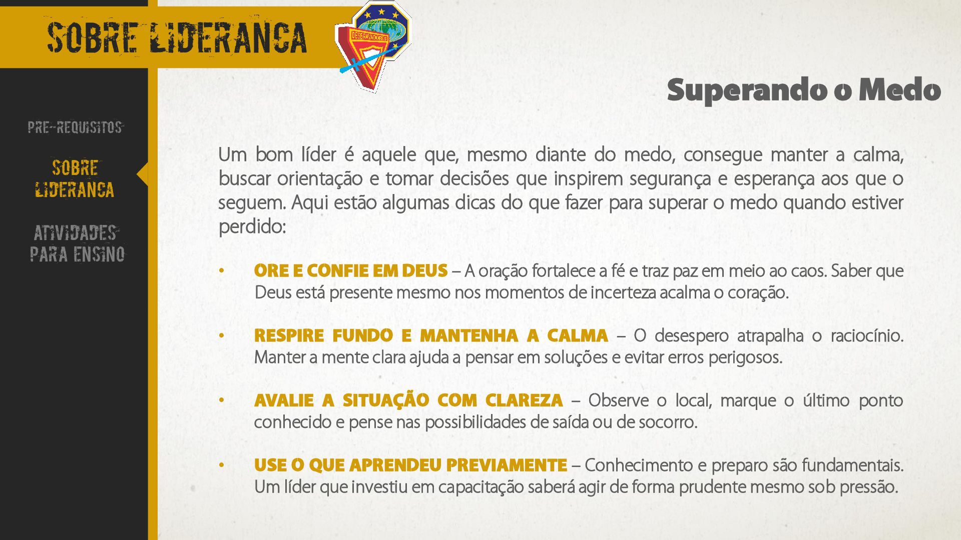 do medo, consegue manter a calma, buscar orientação e tomar decisões que inspirem segurança e esperança aos que o seguem. Aqui estão algumas dicas do que fazer para superar o medo quando estiver perdido: • ORE E CONFIE EM DEUS – A oração fortalece a fé e traz paz em meio ao caos. Saber que Deus está presente mesmo nos momentos de incerteza acalma o coração. • RESPIRE FUNDO E MANTENHA A CALMA – O desespero atrapalha o raciocínio. Manter a mente clara ajuda a pensar em soluções e evitar erros perigosos. • AVALIE A SITUAÇÃO COM CLAREZA – Observe o local, marque o último ponto conhecido e pense nas possibilidades de saída ou de socorro. • USE O QUE APRENDEU PREVIAMENTE – Conhecimento e preparo são fundamentais. Um líder que investiu em capacitação saberá agir de forma prudente mesmo sob pressão. Superando o Medo PRE-REQUISITOS SOBRE LIDERANCA ATIVIDADES PARA ENSINO
