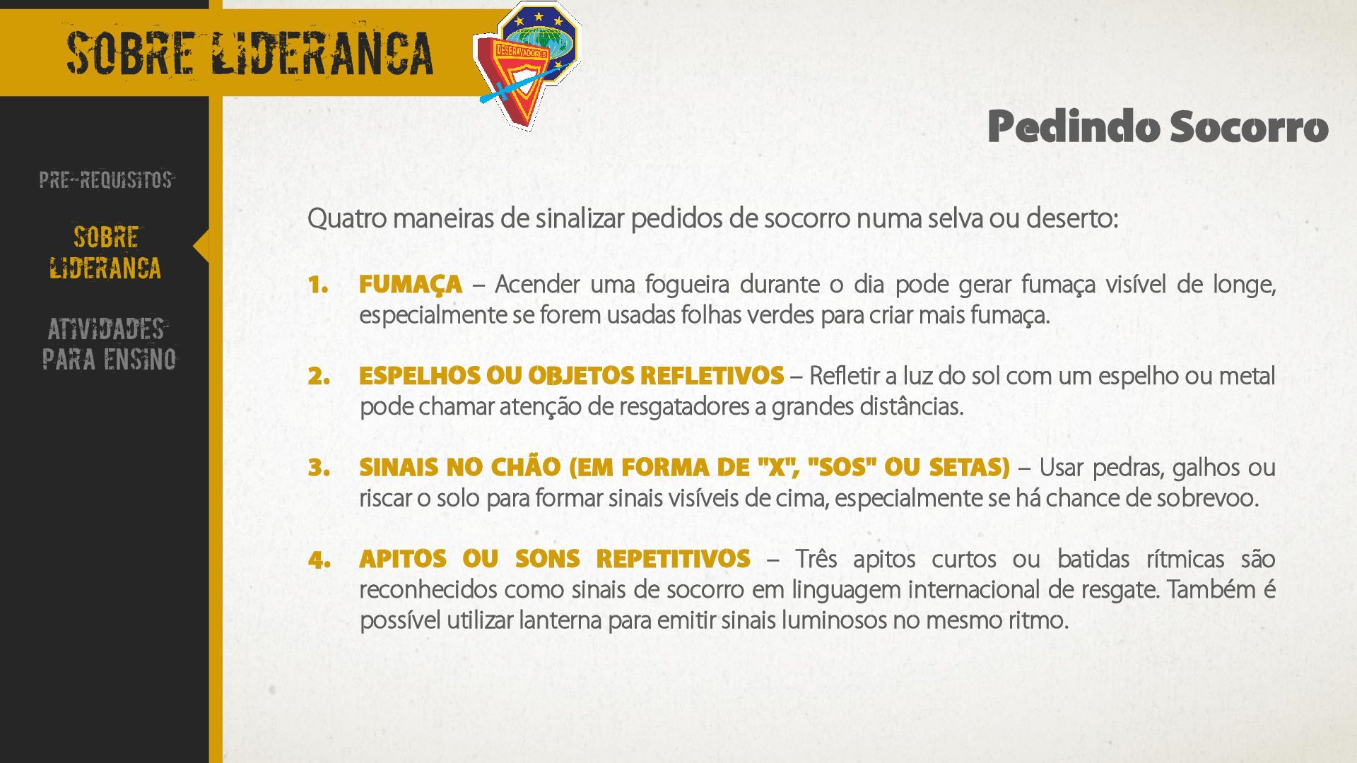 selva ou deserto: 1. FUMAÇA – Acender uma fogueira durante o dia pode gerar fumaça visível de longe, especialmente se forem usadas folhas verdes para criar mais fumaça. 2. ESPELHOS OU OBJETOS REFLETIVOS – Refletir a luz do sol com um espelho ou metal pode chamar atenção de resgatadores a grandes distâncias. 3. SINAIS NO CHÃO (EM FORMA DE "X", "SOS" OU SETAS) – Usar pedras, galhos ou riscar o solo para formar sinais visíveis de cima, especialmente se há chance de sobrevoo. 4. APITOS OU SONS REPETITIVOS – Três apitos curtos ou batidas rítmicas são reconhecidos como sinais de socorro em linguagem internacional de resgate. Também é possível utilizar lanterna para emitir sinais luminosos no mesmo ritmo. Pedindo Socorro PRE-REQUISITOS SOBRE LIDERANCA ATIVIDADES PARA ENSINO