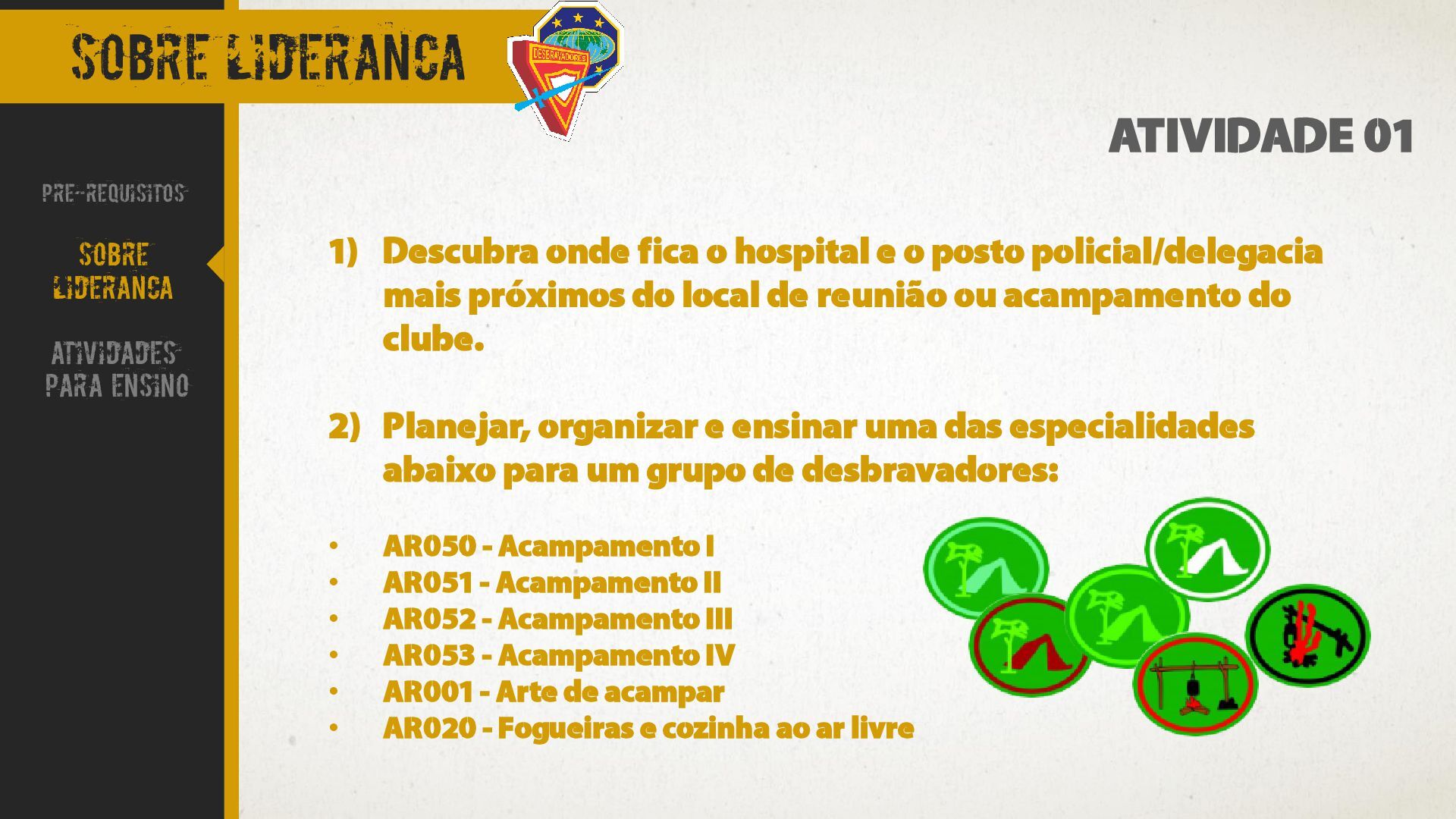 mais próximos do local de reunião ou acampamento do clube. 2) Planejar, organizar e ensinar uma das especialidades abaixo para um grupo de desbravadores: • AR050 - Acampamento I • AR051 - Acampamento II • AR052 - Acampamento III • AR053 - Acampamento IV • AR001 - Arte de acampar • AR020 - Fogueiras e cozinha ao ar livre ATIVIDADE 01 SOBRE LIDERANCA PRE-REQUISITOS SOBRE LIDERANCA ATIVIDADES PARA ENSINO