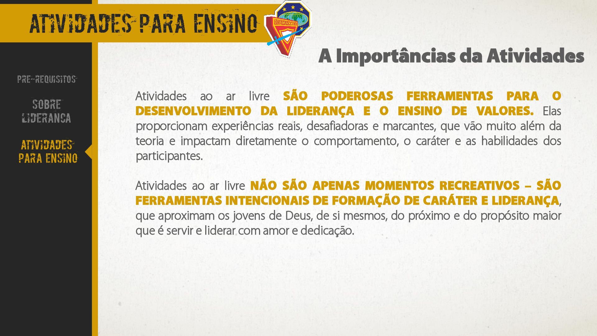 PARA O DESENVOLVIMENTO DA LIDERANÇA E O ENSINO DE VALORES. Elas proporcionam experiências reais, desafiadoras e marcantes, que vão muito além da teoria e impactam diretamente o comportamento, o caráter e as habilidades dos participantes. Atividades ao ar livre NÃO SÃO APENAS MOMENTOS RECREATIVOS – SÃO FERRAMENTAS INTENCIONAIS DE FORMAÇÃO DE CARÁTER E LIDERANÇA, que aproximam os jovens de Deus, de si mesmos, do próximo e do propósito maior que é servir e liderar com amor e dedicação. A Importâncias da Atividades PRE-REQUISITOS SOBRE LIDERANCA ATIVIDADES PARA ENSINO