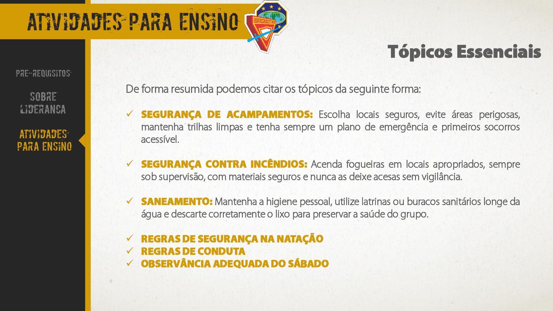 da seguinte forma: ✓ SEGURANÇA DE ACAMPAMENTOS: Escolha locais seguros, evite áreas perigosas, mantenha trilhas limpas e tenha sempre um plano de emergência e primeiros socorros acessível. ✓ SEGURANÇA CONTRA INCÊNDIOS: Acenda fogueiras em locais apropriados, sempre sob supervisão, com materiais seguros e nunca as deixe acesas sem vigilância. ✓ SANEAMENTO: Mantenha a higiene pessoal, utilize latrinas ou buracos sanitários longe da água e descarte corretamente o lixo para preservar a saúde do grupo. ✓ REGRAS DE SEGURANÇA NA NATAÇÃO ✓ REGRAS DE CONDUTA ✓ OBSERVÂNCIA ADEQUADA DO SÁBADO Tópicos Essenciais PRE-REQUISITOS SOBRE LIDERANCA ATIVIDADES PARA ENSINO