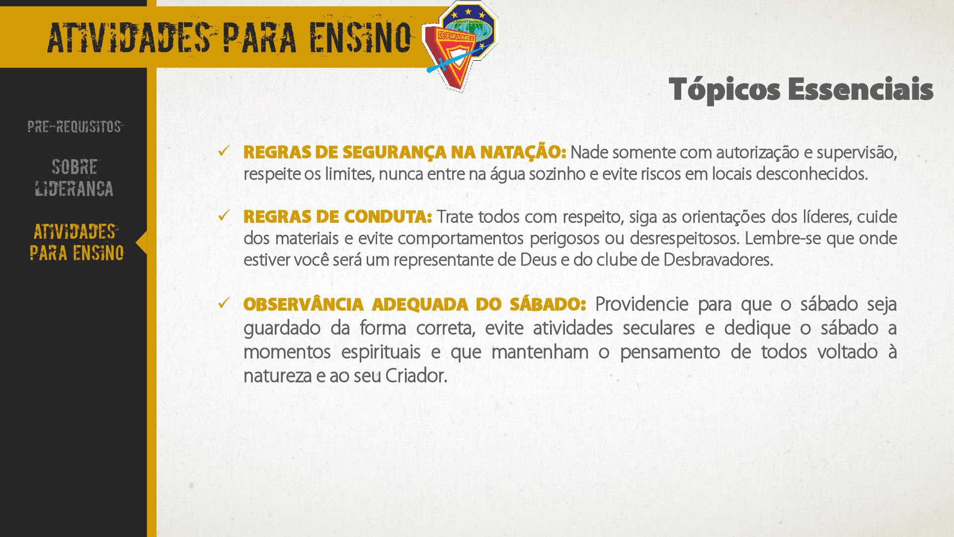 somente com autorização e supervisão, respeite os limites, nunca entre na água sozinho e evite riscos em locais desconhecidos. ✓ REGRAS DE CONDUTA: Trate todos com respeito, siga as orientações dos líderes, cuide dos materiais e evite comportamentos perigosos ou desrespeitosos. Lembre-se que onde estiver você será um representante de Deus e do clube de Desbravadores. ✓ OBSERVÂNCIA ADEQUADA DO SÁBADO: Providencie para que o sábado seja guardado da forma correta, evite atividades seculares e dedique o sábado a momentos espirituais e que mantenham o pensamento de todos voltado à natureza e ao seu Criador. Tópicos Essenciais PRE-REQUISITOS SOBRE LIDERANCA ATIVIDADES PARA ENSINO