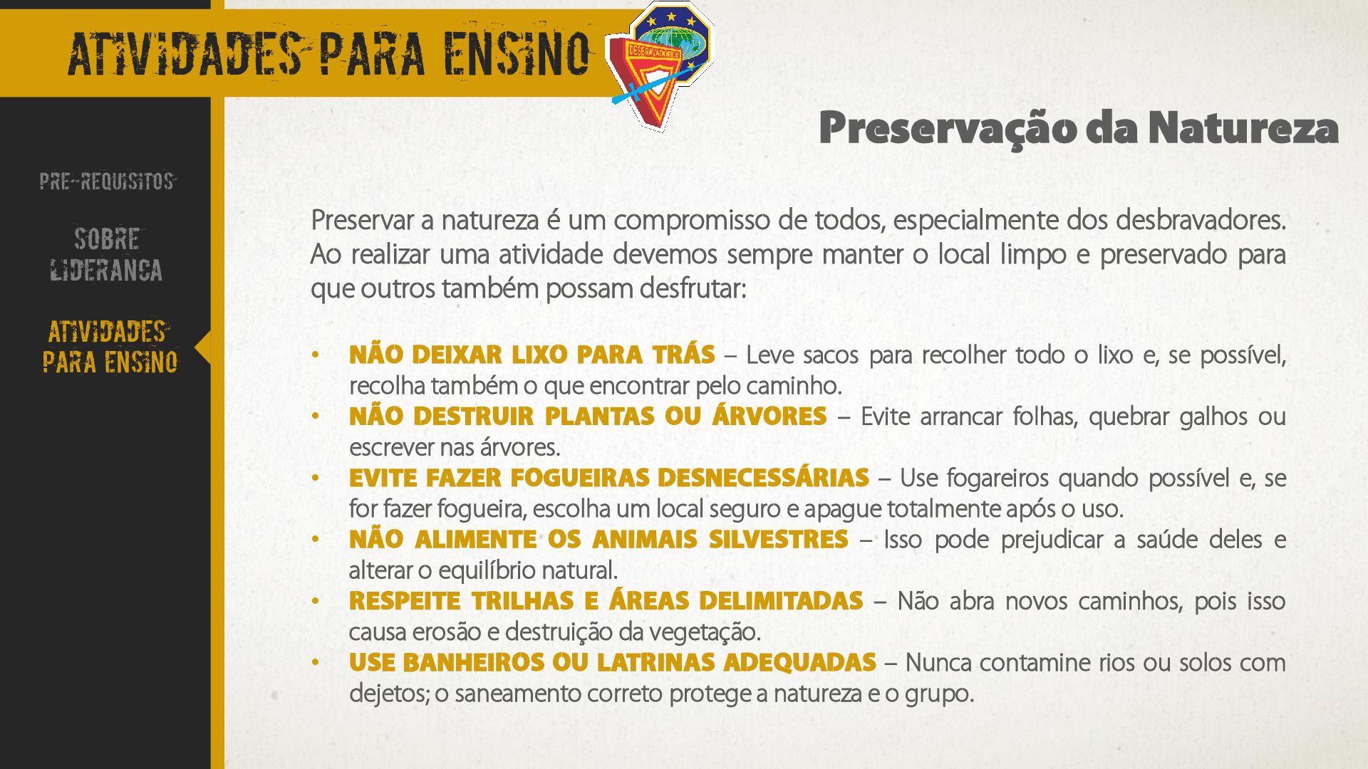 todos, especialmente dos desbravadores. Ao realizar uma atividade devemos sempre manter o local limpo e preservado para que outros também possam desfrutar: • NÃO DEIXAR LIXO PARA TRÁS – Leve sacos para recolher todo o lixo e, se possível, recolha também o que encontrar pelo caminho. • NÃO DESTRUIR PLANTAS OU ÁRVORES – Evite arrancar folhas, quebrar galhos ou escrever nas árvores. • EVITE FAZER FOGUEIRAS DESNECESSÁRIAS – Use fogareiros quando possível e, se for fazer fogueira, escolha um local seguro e apague totalmente após o uso. • NÃO ALIMENTE OS ANIMAIS SILVESTRES – Isso pode prejudicar a saúde deles e alterar o equilíbrio natural. • RESPEITE TRILHAS E ÁREAS DELIMITADAS – Não abra novos caminhos, pois isso causa erosão e destruição da vegetação. • USE BANHEIROS OU LATRINAS ADEQUADAS – Nunca contamine rios ou solos com dejetos; o saneamento correto protege a natureza e o grupo. Preservação da Natureza PRE-REQUISITOS SOBRE LIDERANCA ATIVIDADES PARA ENSINO
