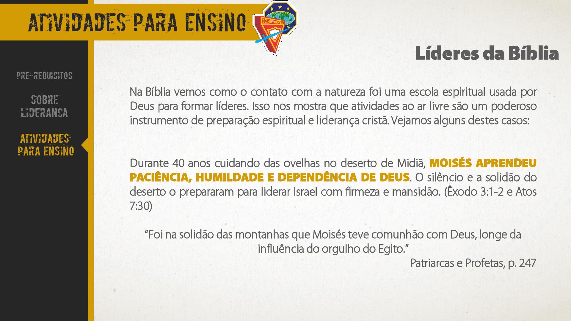 a natureza foi uma escola espiritual usada por Deus para formar líderes. Isso nos mostra que atividades ao ar livre são um poderoso instrumento de preparação espiritual e liderança cristã. Vejamos alguns destes casos: Durante 40 anos cuidando das ovelhas no deserto de Midiã, MOISÉS APRENDEU PACIÊNCIA, HUMILDADE E DEPENDÊNCIA DE DEUS. O silêncio e a solidão do deserto o prepararam para liderar Israel com firmeza e mansidão. (Êxodo 3:1-2 e Atos 7:30) “Foi na solidão das montanhas que Moisés teve comunhão com Deus, longe da influência do orgulho do Egito.” Patriarcas e Profetas, p. 247 Líderes da Bíblia PRE-REQUISITOS SOBRE LIDERANCA ATIVIDADES PARA ENSINO