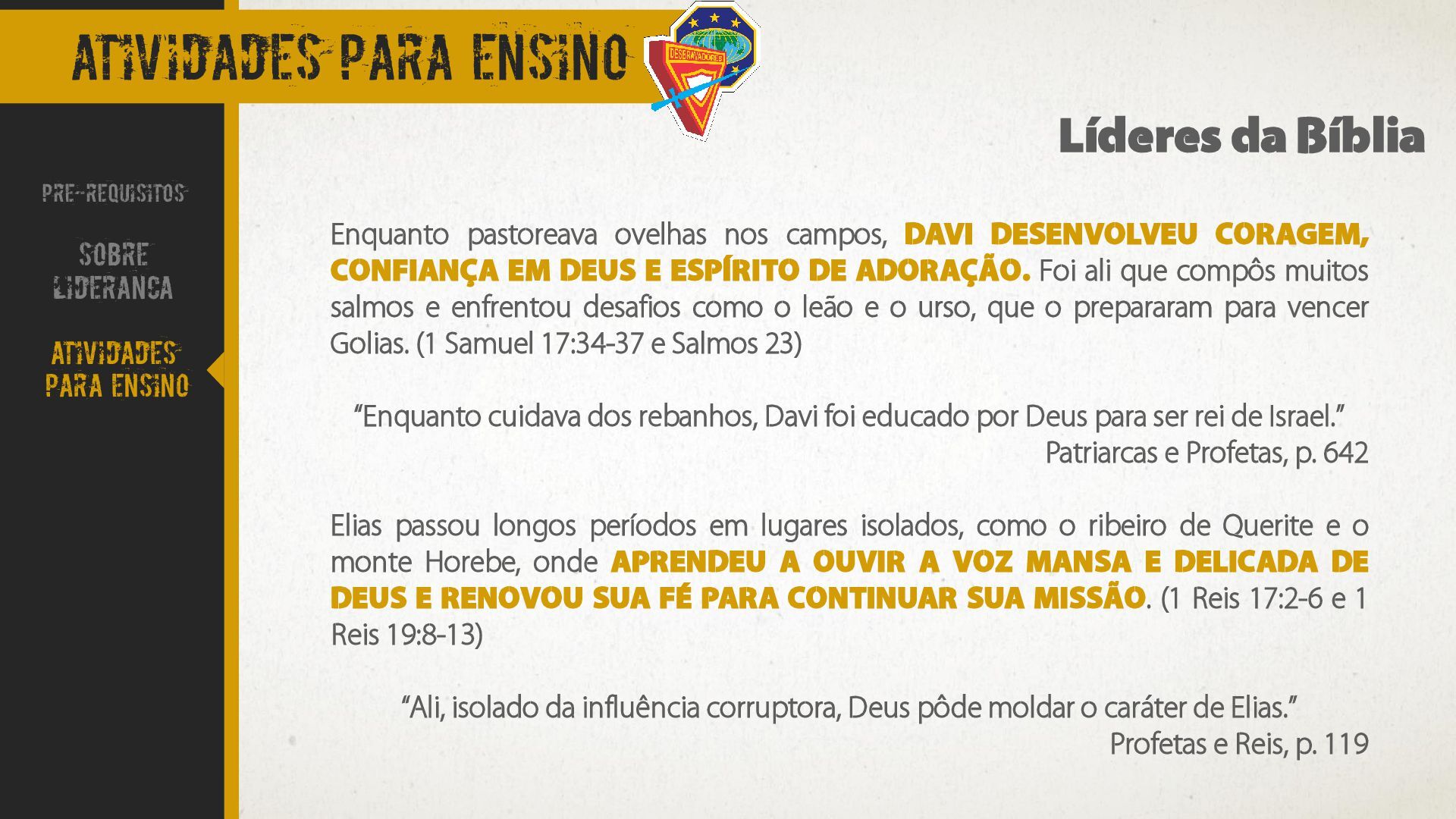 CORAGEM, CONFIANÇA EM DEUS E ESPÍRITO DE ADORAÇÃO. Foi ali que compôs muitos salmos e enfrentou desafios como o leão e o urso, que o prepararam para vencer Golias. (1 Samuel 17:34-37 e Salmos 23) “Enquanto cuidava dos rebanhos, Davi foi educado por Deus para ser rei de Israel.” Patriarcas e Profetas, p. 642 Elias passou longos períodos em lugares isolados, como o ribeiro de Querite e o monte Horebe, onde APRENDEU A OUVIR A VOZ MANSA E DELICADA DE DEUS E RENOVOU SUA FÉ PARA CONTINUAR SUA MISSÃO. (1 Reis 17:2-6 e 1 Reis 19:8-13) “Ali, isolado da influência corruptora, Deus pôde moldar o caráter de Elias.” Profetas e Reis, p. 119 Líderes da Bíblia PRE-REQUISITOS SOBRE LIDERANCA ATIVIDADES PARA ENSINO