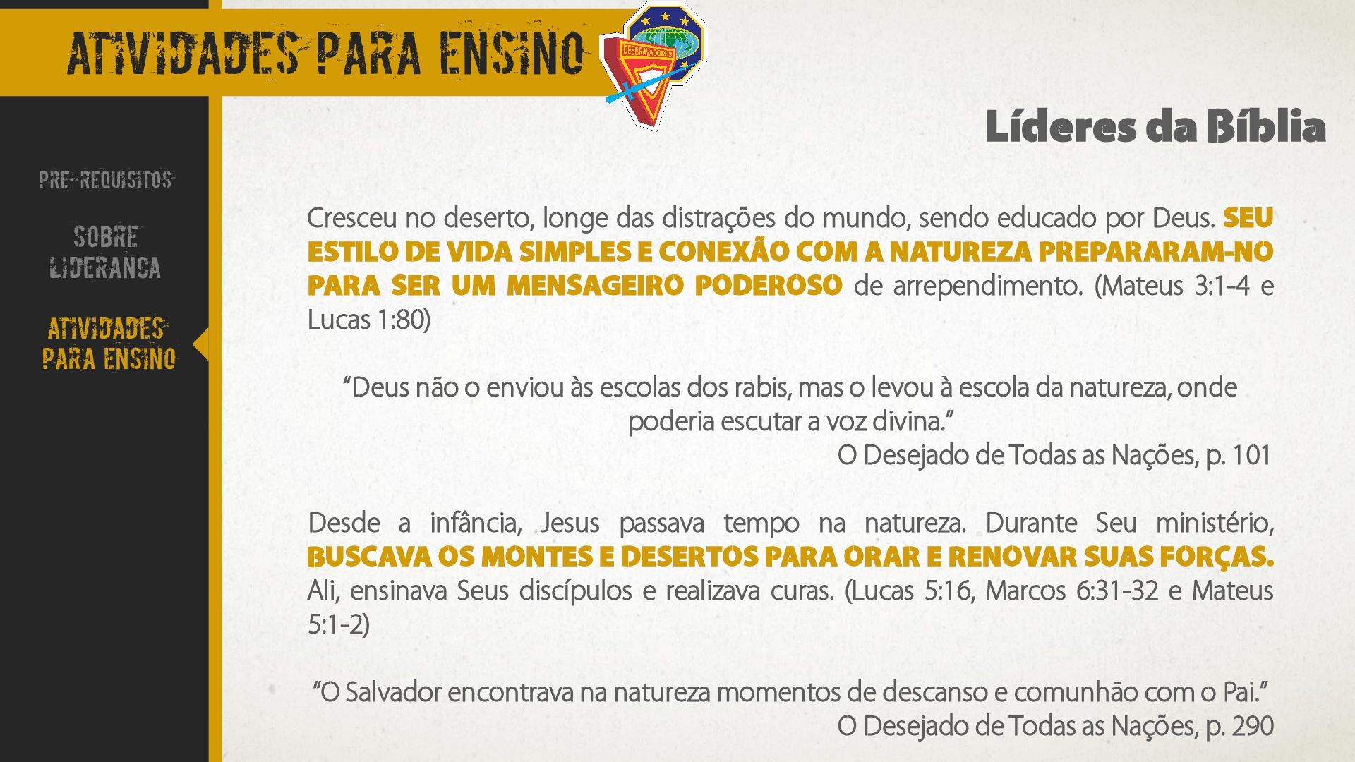mundo, sendo educado por Deus. SEU ESTILO DE VIDA SIMPLES E CONEXÃO COM A NATUREZA PREPARARAM-NO PARA SER UM MENSAGEIRO PODEROSO de arrependimento. (Mateus 3:1-4 e Lucas 1:80) “Deus não o enviou às escolas dos rabis, mas o levou à escola da natureza, onde poderia escutar a voz divina.” O Desejado de Todas as Nações, p. 101 Desde a infância, Jesus passava tempo na natureza. Durante Seu ministério, BUSCAVA OS MONTES E DESERTOS PARA ORAR E RENOVAR SUAS FORÇAS. Ali, ensinava Seus discípulos e realizava curas. (Lucas 5:16, Marcos 6:31-32 e Mateus 5:1-2) “O Salvador encontrava na natureza momentos de descanso e comunhão com o Pai.” O Desejado de Todas as Nações, p. 290 Líderes da Bíblia PRE-REQUISITOS SOBRE LIDERANCA ATIVIDADES PARA ENSINO
