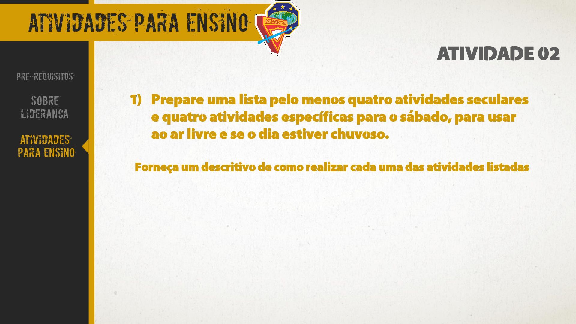 1) Prepare uma lista pelo menos quatro atividades seculares e quatro atividades específicas para o sábado, para usar ao ar livre e se o dia estiver chuvoso. Forneça um descritivo de como realizar cada uma das atividades listadas ATIVIDADE 02