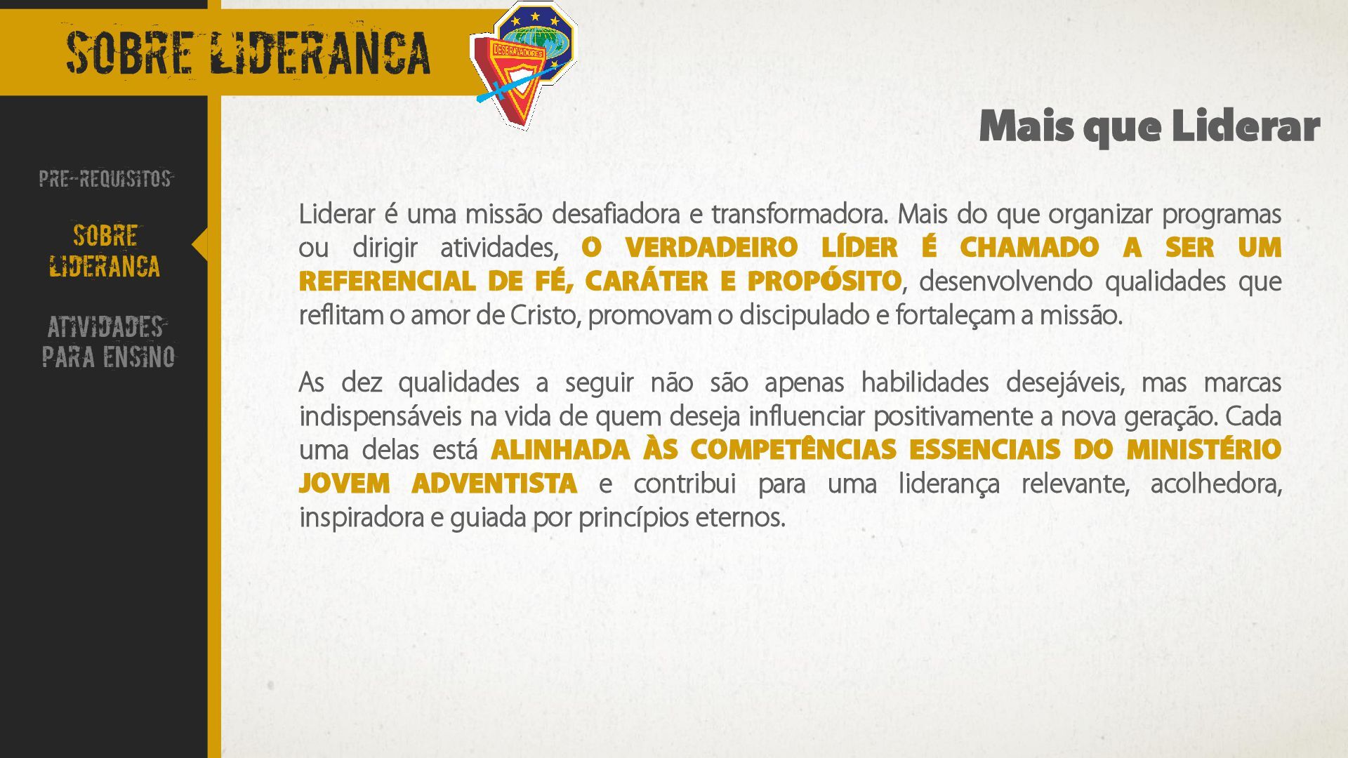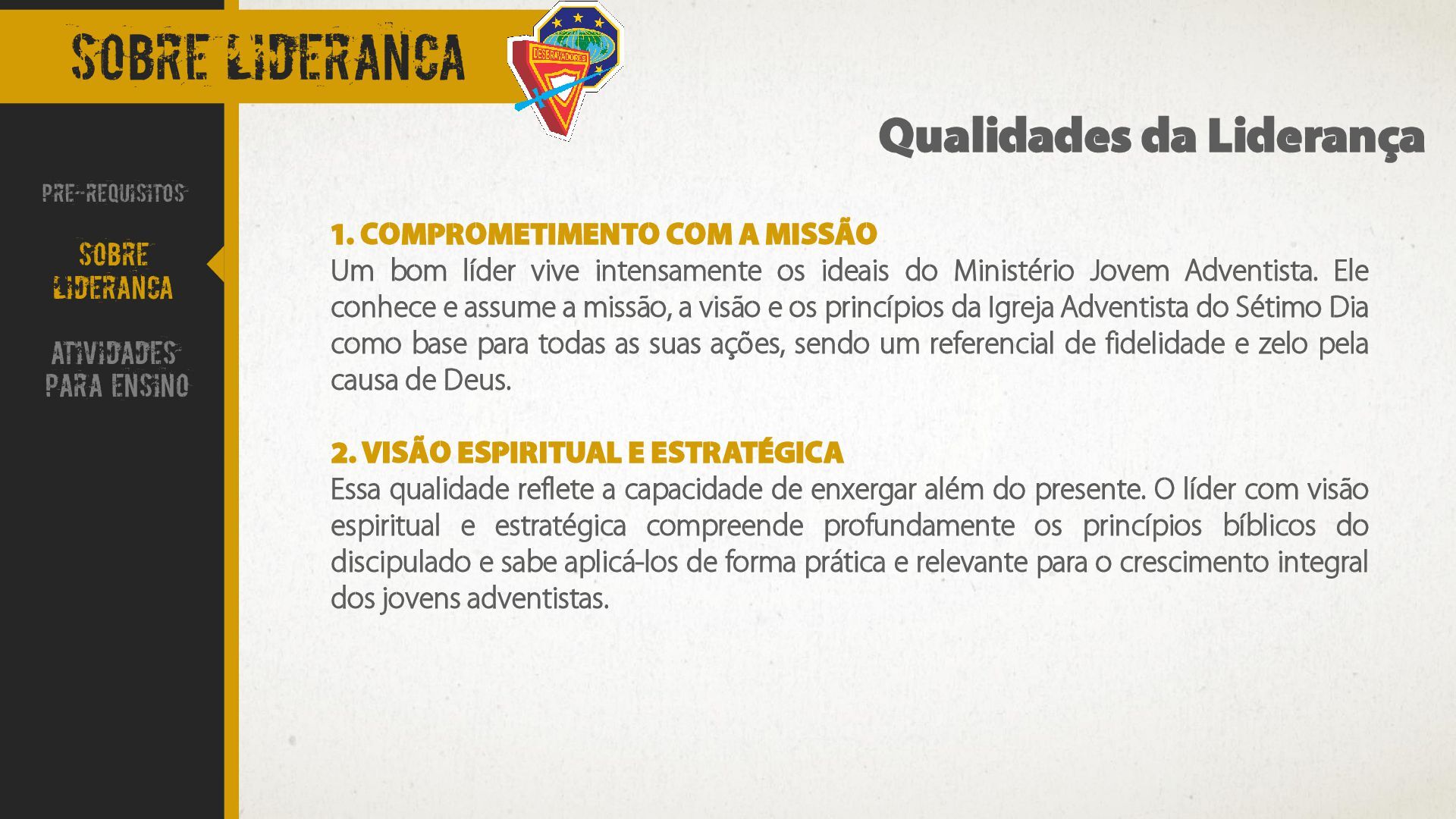 vive intensamente os ideais do Ministério Jovem Adventista. Ele conhece e assume a missão, a visão e os princípios da Igreja Adventista do Sétimo Dia como base para todas as suas ações, sendo um referencial de fidelidade e zelo pela causa de Deus. 2. VISÃO ESPIRITUAL E ESTRATÉGICA Essa qualidade reflete a capacidade de enxergar além do presente. O líder com visão espiritual e estratégica compreende profundamente os princípios bíblicos do discipulado e sabe aplicá-los de forma prática e relevante para o crescimento integral dos jovens adventistas. Qualidades da Liderança PRE-REQUISITOS SOBRE LIDERANCA ATIVIDADES PARA ENSINO