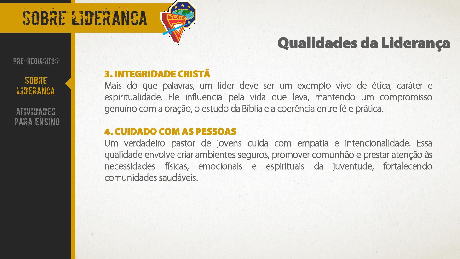 líder deve ser um exemplo vivo de ética, caráter e espiritualidade. Ele influencia pela vida que leva, mantendo um compromisso genuíno com a oração, o estudo da Bíblia e a coerência entre fé e prática. 4. CUIDADO COM AS PESSOAS Um verdadeiro pastor de jovens cuida com empatia e intencionalidade. Essa qualidade envolve criar ambientes seguros, promover comunhão e prestar atenção às necessidades físicas, emocionais e espirituais da juventude, fortalecendo comunidades saudáveis. Qualidades da Liderança PRE-REQUISITOS SOBRE LIDERANCA ATIVIDADES PARA ENSINO