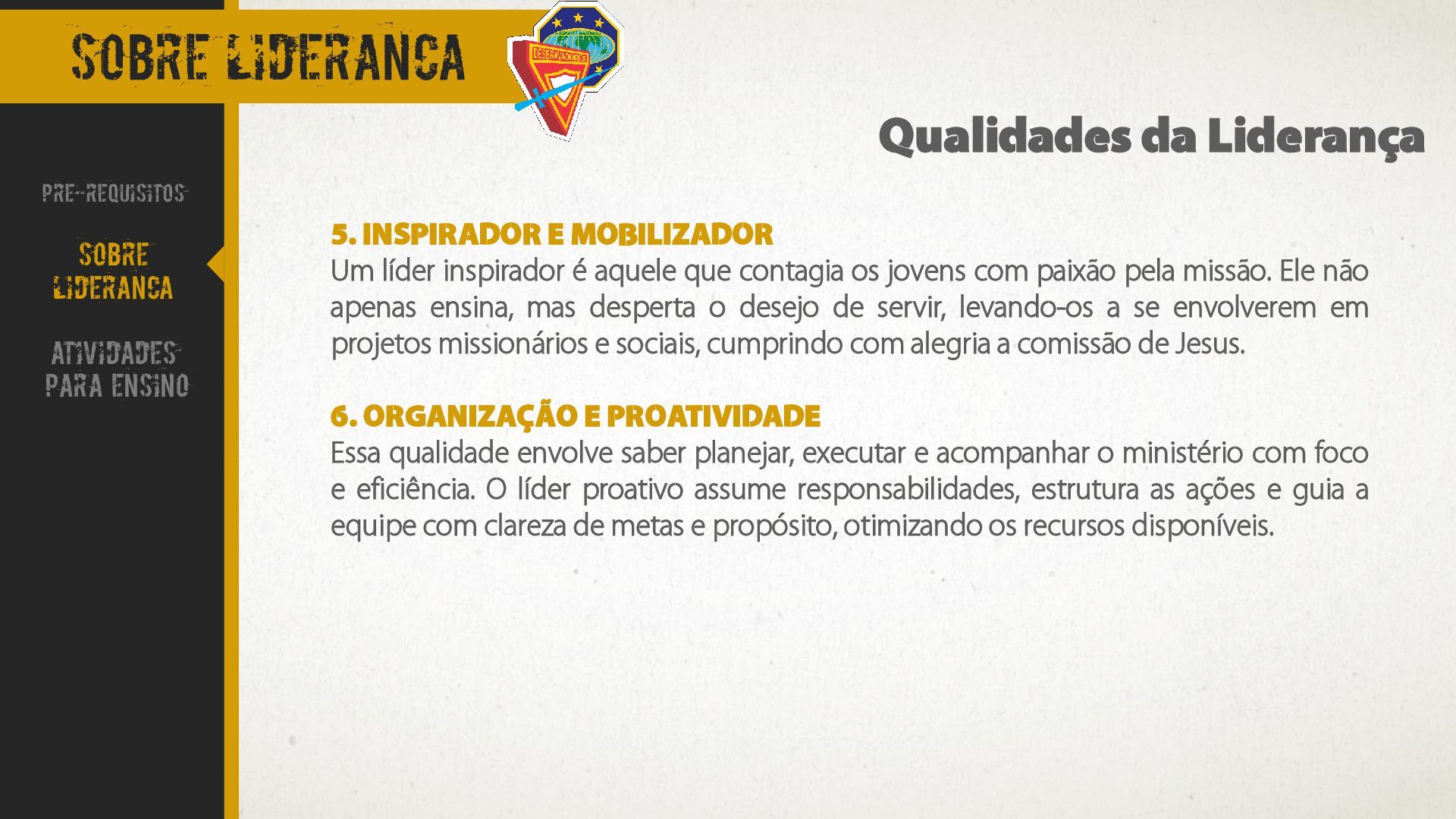 aquele que contagia os jovens com paixão pela missão. Ele não apenas ensina, mas desperta o desejo de servir, levando-os a se envolverem em projetos missionários e sociais, cumprindo com alegria a comissão de Jesus. 6. ORGANIZAÇÃO E PROATIVIDADE Essa qualidade envolve saber planejar, executar e acompanhar o ministério com foco e eficiência. O líder proativo assume responsabilidades, estrutura as ações e guia a equipe com clareza de metas e propósito, otimizando os recursos disponíveis. Qualidades da Liderança PRE-REQUISITOS SOBRE LIDERANCA ATIVIDADES PARA ENSINO