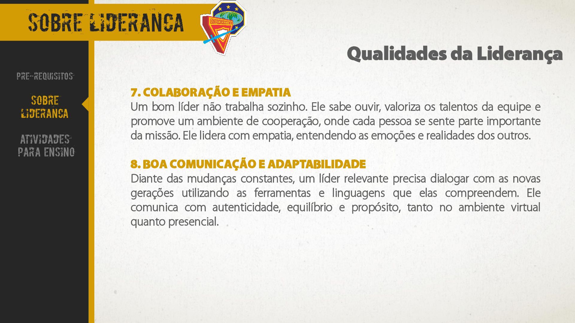 trabalha sozinho. Ele sabe ouvir, valoriza os talentos da equipe e promove um ambiente de cooperação, onde cada pessoa se sente parte importante da missão. Ele lidera com empatia, entendendo as emoções e realidades dos outros. 8. BOA COMUNICAÇÃO E ADAPTABILIDADE Diante das mudanças constantes, um líder relevante precisa dialogar com as novas gerações utilizando as ferramentas e linguagens que elas compreendem. Ele comunica com autenticidade, equilíbrio e propósito, tanto no ambiente virtual quanto presencial. Qualidades da Liderança PRE-REQUISITOS SOBRE LIDERANCA ATIVIDADES PARA ENSINO