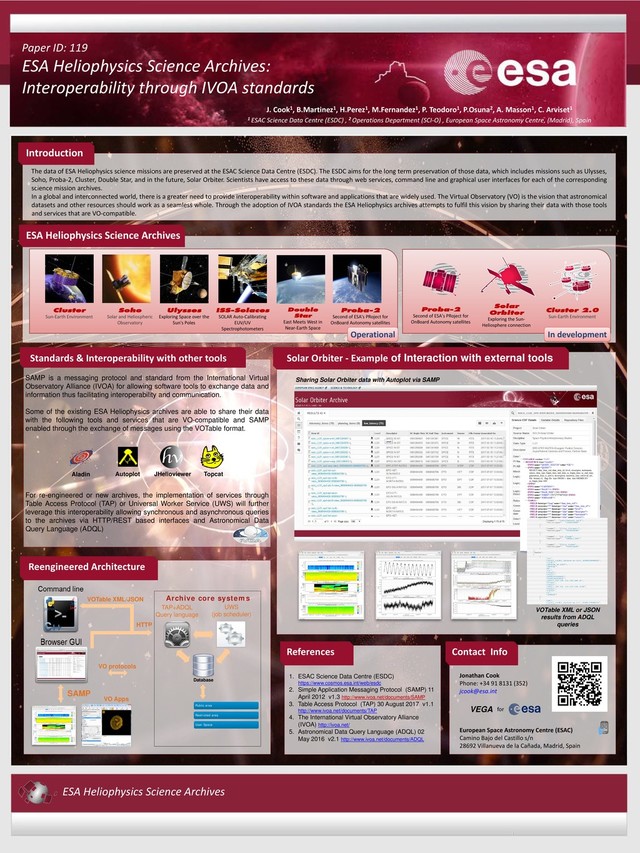 Astronomy Centre (ESAC) Camino Bajo del Castillo s/n 28692 Villanueva de la Cañada, Madrid, Spain Paper ID: 119 ESA Heliophysics Science Archives: Interoperability through IVOA standards J. Cook1, B.Martinez1, H.Perez1, M.Fernandez1, P. Teodoro1, P.Osuna2, A. Masson1, C. Arviset1 1 ESAC Science Data Centre (ESDC) , 2 Operations Department (SCI-O) , European Space Astronomy Centre, (Madrid), Spain Introduction ESA Heliophysics Science Archives 1. ESAC Science Data Centre (ESDC) https://www.cosmos.esa.int/web/esdc 2. Simple Application Messaging Protocol (SAMP) 11 April 2012 v1.3 http://www.ivoa.net/documents/SAMP 3. Table Access Protocol (TAP) 30 August 2017 v1.1 http://www.ivoa.net/documents/TAP 4. The International Virtual Observatory Alliance (IVOA) http://ivoa.net/ 5. Astronomical Data Query Language (ADQL) 02 May 2016 v2.1 http://www.ivoa.net/documents/ADQL The data of ESA Heliophysics science missions are preserved at the ESAC Science Data Centre (ESDC). The ESDC aims for the long term preservation of those data, which includes missions such as Ulysses, Soho, Proba-2, Cluster, Double Star, and in the future, Solar Orbiter. Scientists have access to these data through web services, command line and graphical user interfaces for each of the corresponding science mission archives. In a global and interconnected world, there is a greater need to provide interoperability within software and applications that are widely used. The Virtual Observatory (VO) is the vision that astronomical datasets and other resources should work as a seamless whole. Through the adoption of IVOA standards the ESA Heliophysics archives attempts to fulfil this vision by sharing their data with those tools and services that are VO-compatible. ISS-Solaces SOLAR Auto-Calibrating EUV/UV Spectrophotometers Double Star East Meets West in Near-Earth Space Ulysses Exploring Space over the Sun's Poles Cluster Sun-Earth Environment Soho Solar and Heliospheric Observatory Operational In development Proba-2 Second of ESA's PRoject for OnBoard Autonomy satellites Solar Orbiter Exploring the Sun- Heliosphere connection Solar Orbiter - Example of Interaction with external tools for Reengineered Architecture References Contact Info Cluster 2.0 Sun-Earth Environment ESA Heliophysics Science Archives SAMP is a messaging protocol and standard from the International Virtual Observatory Alliance (IVOA) for allowing software tools to exchange data and information thus facilitating interoperability and communication. Some of the existing ESA Heliophysics archives are able to share their data with the following tools and services that are VO-compatible and SAMP enabled through the exchange of messages using the VOTable format. For re-engineered or new archives, the implementation of services through Table Access Protocol (TAP) or Universal Worker Service (UWS) will further leverage this interoperability allowing synchronous and asynchronous queries to the archives via HTTP/REST based interfaces and Astronomical Data Query Language (ADQL) Standards & Interoperability with other tools Aladin Autoplot JHelioviewer Topcat Database Archive core systems TAP+ADQL Query language UWS (job scheduler) SAMP VOTable XML/JSON HTTP Public area Restricted area User Space Sharing Solar Orbiter data with Autoplot via SAMP VOTable XML or JSON results from ADQL queries VEGA VO protocols VO Apps Proba-2 Second of ESA's PRoject for OnBoard Autonomy satellites