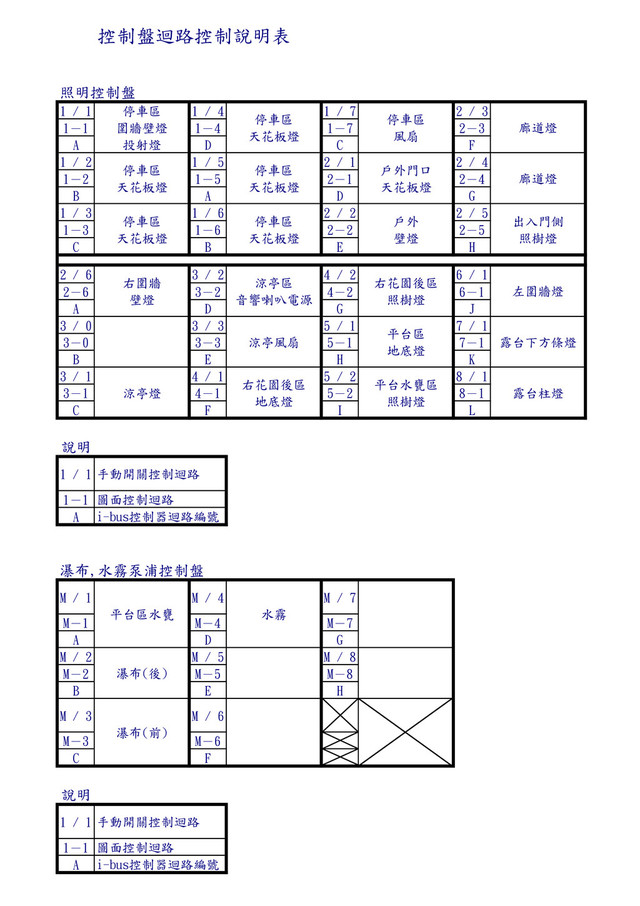 7 2 / 3 1-1 1-4 1-7 2-3 A D C F 1 / 2 1 / 5 2 / 1 2 / 4 1-2 1-5 2-1 2-4 B A D G 1 / 3 1 / 6 2 / 2 2 / 5 1-3 1-6 2-2 2-5 C B E H 2 / 6 3 / 2 4 / 2 6 / 1 2-6 3-2 4-2 6-1 A D G J 3 / 0 3 / 3 5 / 1 7 / 1 3-0 3-3 5-1 7-1 B E H K 3 / 1 4 / 1 5 / 2 8 / 1 3-1 4-1 5-2 8-1 C F I L 說明 1 / 1 1-1 A 瀑布,水霧泵浦控制盤 M / 1 M / 4 M / 7 M-1 M-4 M-7 A D G M / 2 M / 5 M / 8 M-2 M-5 M-8 B E H M / 3 M / 6 M-3 M-6 C F 說明 1 / 1 1-1 A 右花園後區 地底燈 涼亭燈 瀑布(後) 露台下方條燈 廊道燈 出入門側 照樹燈 平台區 地底燈 右花園後區 照樹燈 手動開關控制迴路 右圍牆 壁燈 涼亭區 音響喇叭電源 涼亭風扇 停車區 天花板燈 左圍牆燈 廊道燈 停車區 風扇 戶外門口 天花板燈 戶外 壁燈 平台水甕區 照樹燈 露台柱燈 停車區 圍牆壁燈 投射燈 停車區 天花板燈 停車區 天花板燈 停車區 天花板燈 停車區 天花板燈 圖面控制迴路 i-bus控制器迴路編號 手動開關控制迴路 圖面控制迴路 i-bus控制器迴路編號 瀑布(前) 平台區水甕 水霧