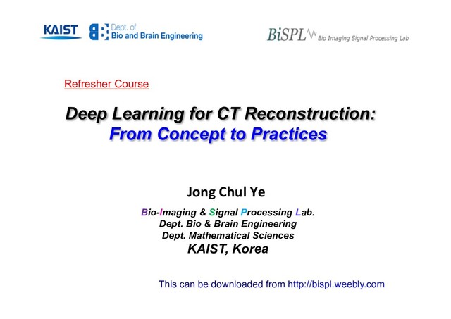 & Brain Engineering Dept. Mathematical Sciences KAIST, Korea Refresher Course Deep Learning for CT Reconstruction: From Concept to Practices This can be downloaded from http://bispl.weebly.com