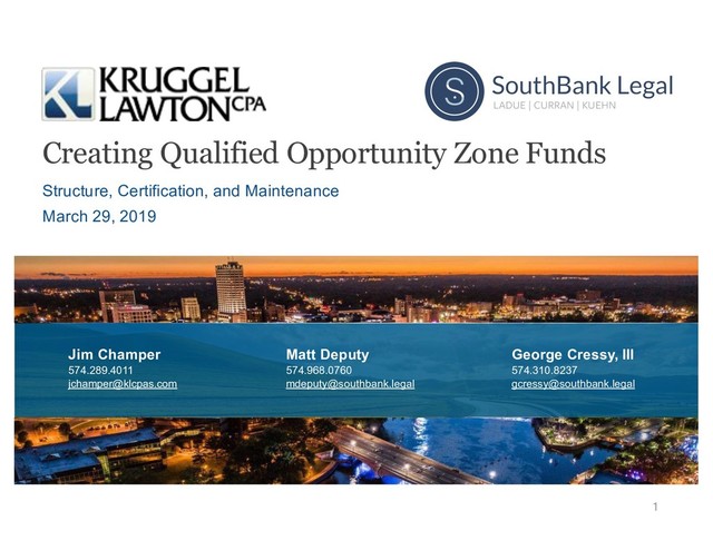not intended to, constitute accounting, tax, or legal advice; instead, all information and content are for general informational purposes only. Information in this presentation may not constitute the most up-to-date accounting, tax, legal, or other information. Readers of this presentation should contact their attorney to obtain advice with respect to any particular matter. No reader should act or refrain from acting on the basis of information in this presentation without first seeking accounting, tax, or legal advice. Use of and access to this presentation do not create an attorney-client relationship between the reader the authors. The views expressed are those of the individual authors writing in their individual capacities only. All liability with respect to actions taken or not taken based on the contents of this presentation are hereby expressly disclaimed. The content in this presentation is provided “as is”; no representations are made that the content is error-free. Jim Champer 574.289.4011