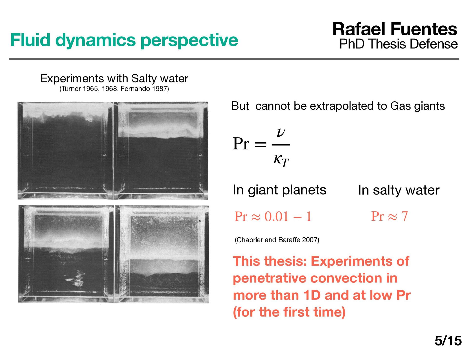 Salty water (Turner 1965, 1968, Fernando 1987) Pr = ν κT In salty water Pr ≈ 7 In giant planets Pr ≈ 0.01 − 1 (Chabrier and Bara ff e 2007) But cannot be extrapolated to Gas giants This thesis: Experiments of penetrative convection in more than 1D and at low Pr (for the fi rst time) 5/15