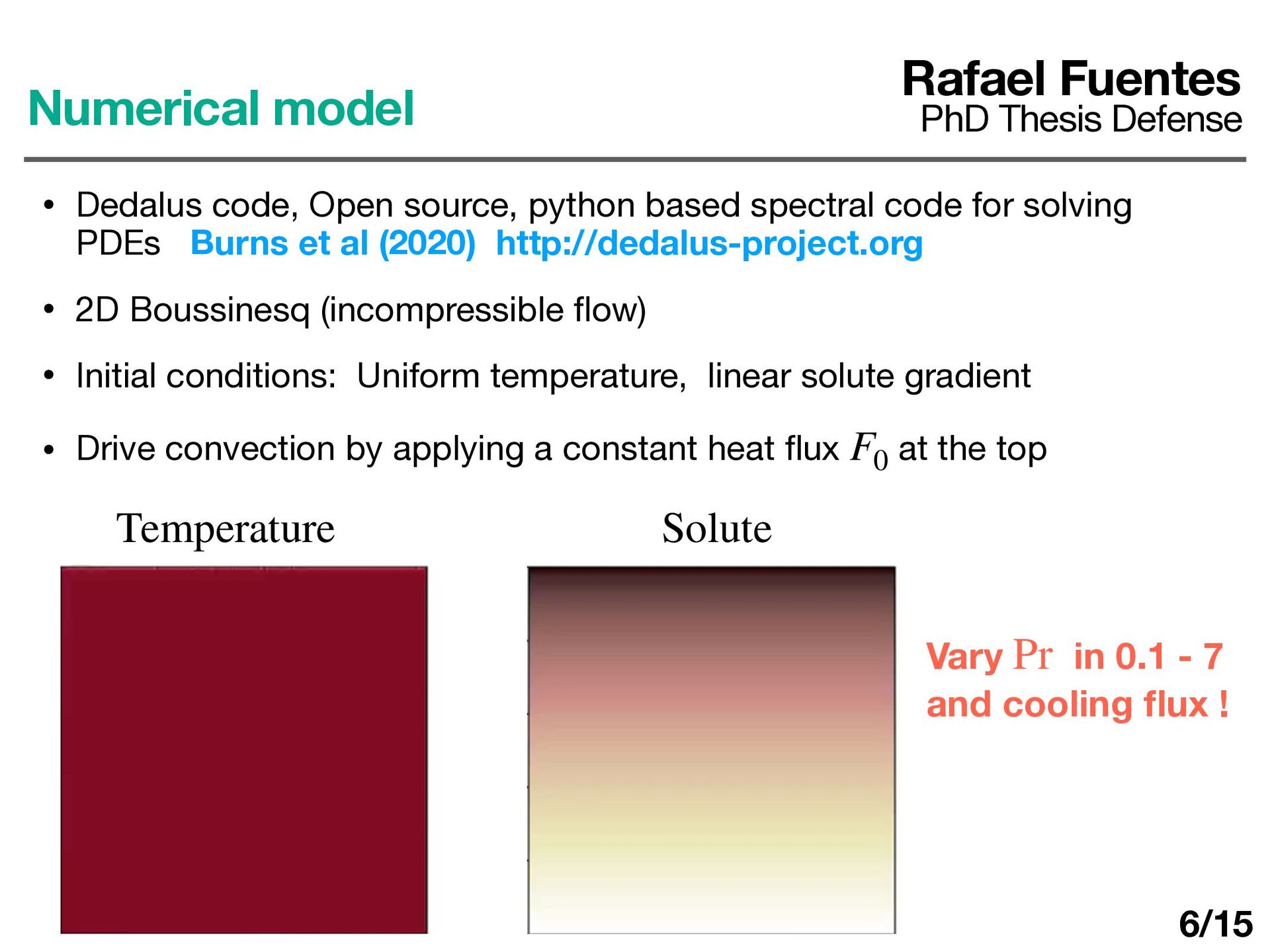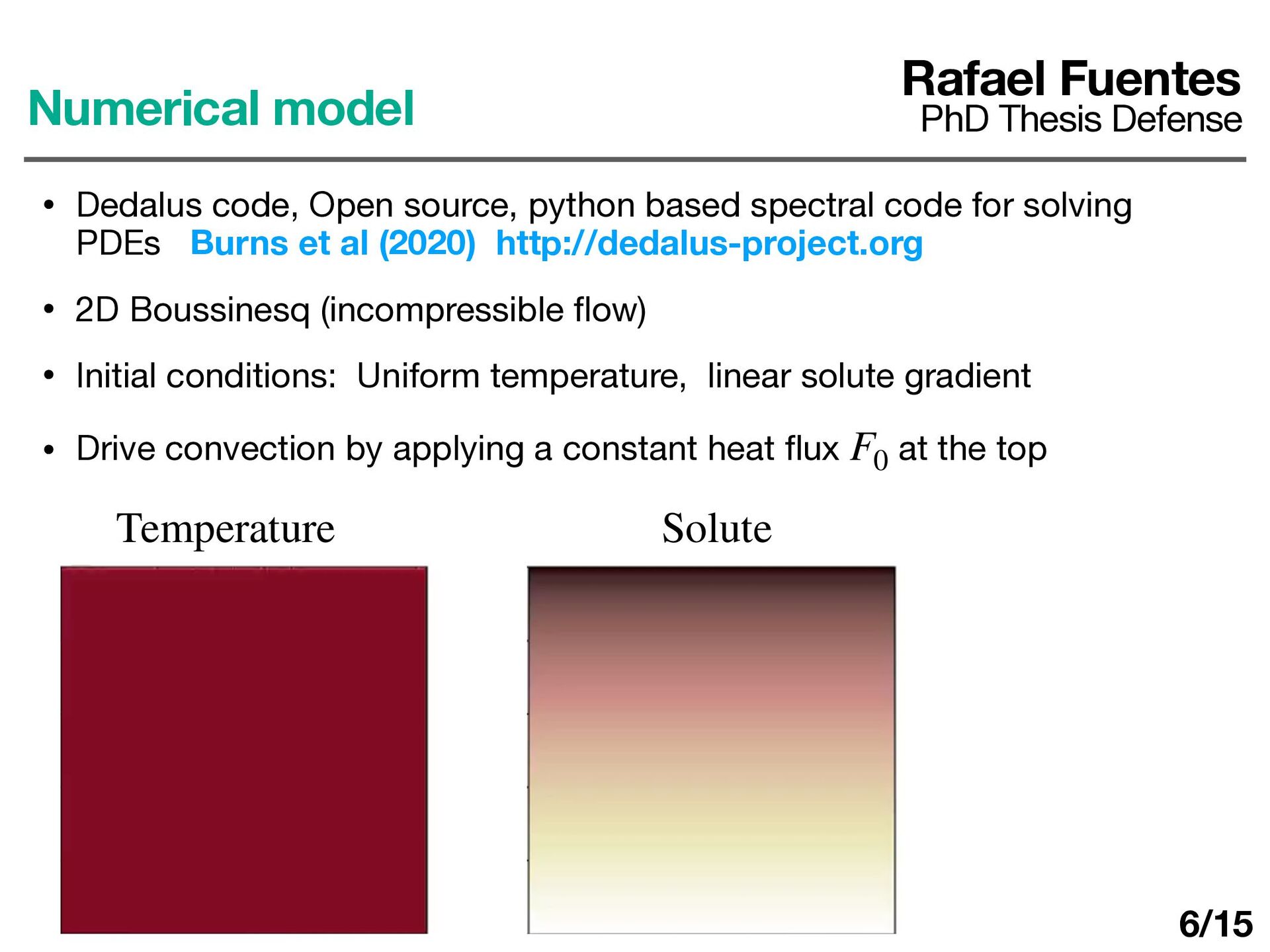 Dedalus code, Open source, python based spectral code for solving PDEs Burns et al (2020) http://dedalus-project.org • 2D Boussinesq (incompressible fl ow) • Initial conditions: Uniform temperature, linear solute gradient • Drive convection by applying a constant heat fl ux at the top F0 6/15