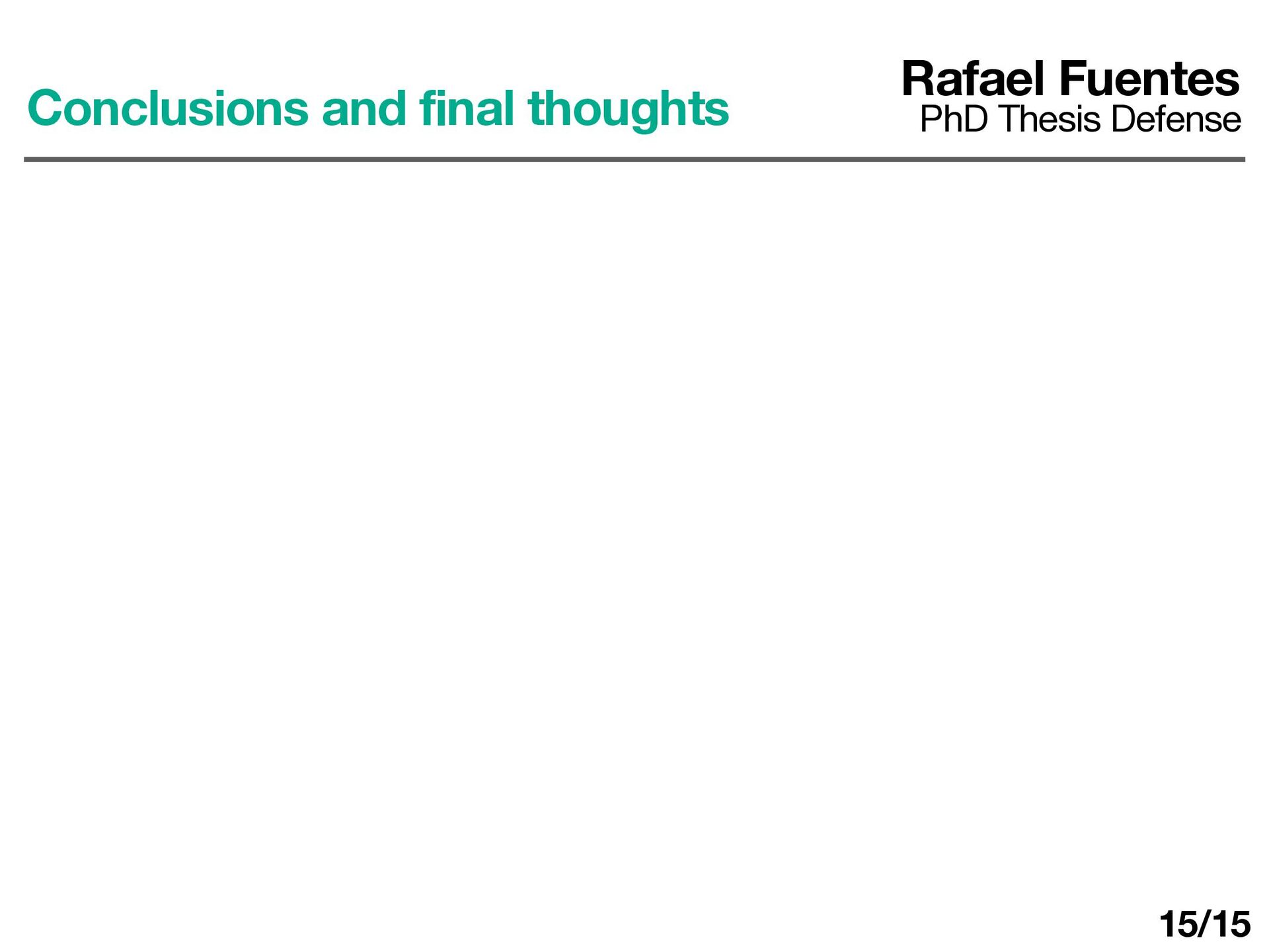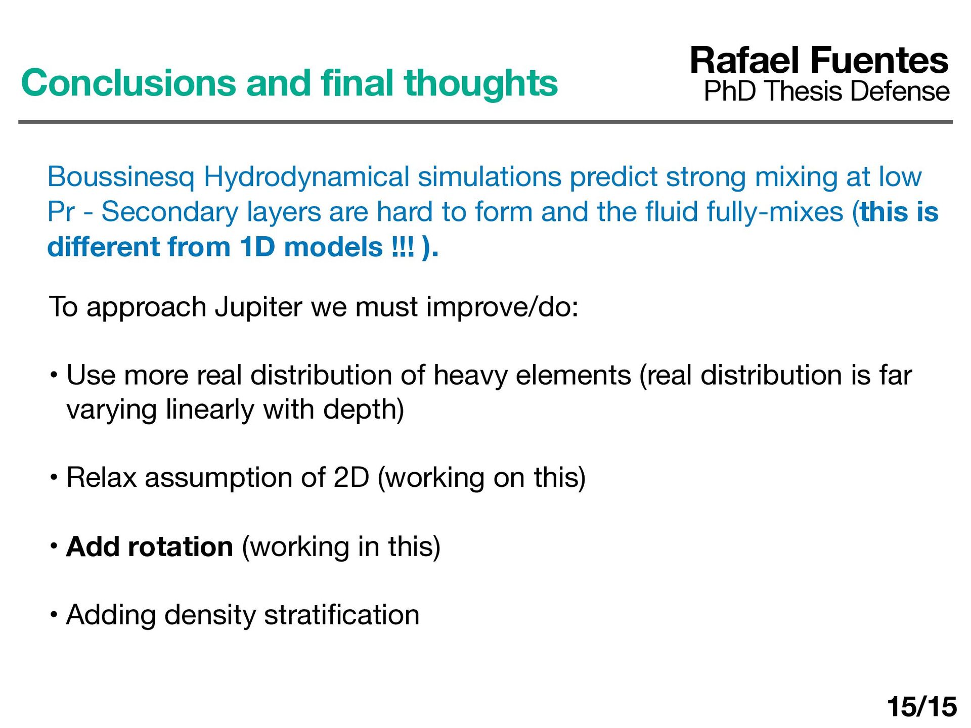 Secondary layers are hard to form and the fl uid fully-mixes (this is di ff erent from 1D models !!! ). Rafael Fuentes PhD Thesis Defense Conclusions and final thoughts To approach Jupiter we must improve/do: • Use more real distribution of heavy elements (real distribution is far varying linearly with depth) • Relax assumption of 2D (working on this) • Add rotation (working in this) • Adding density strati fi cation 15/15