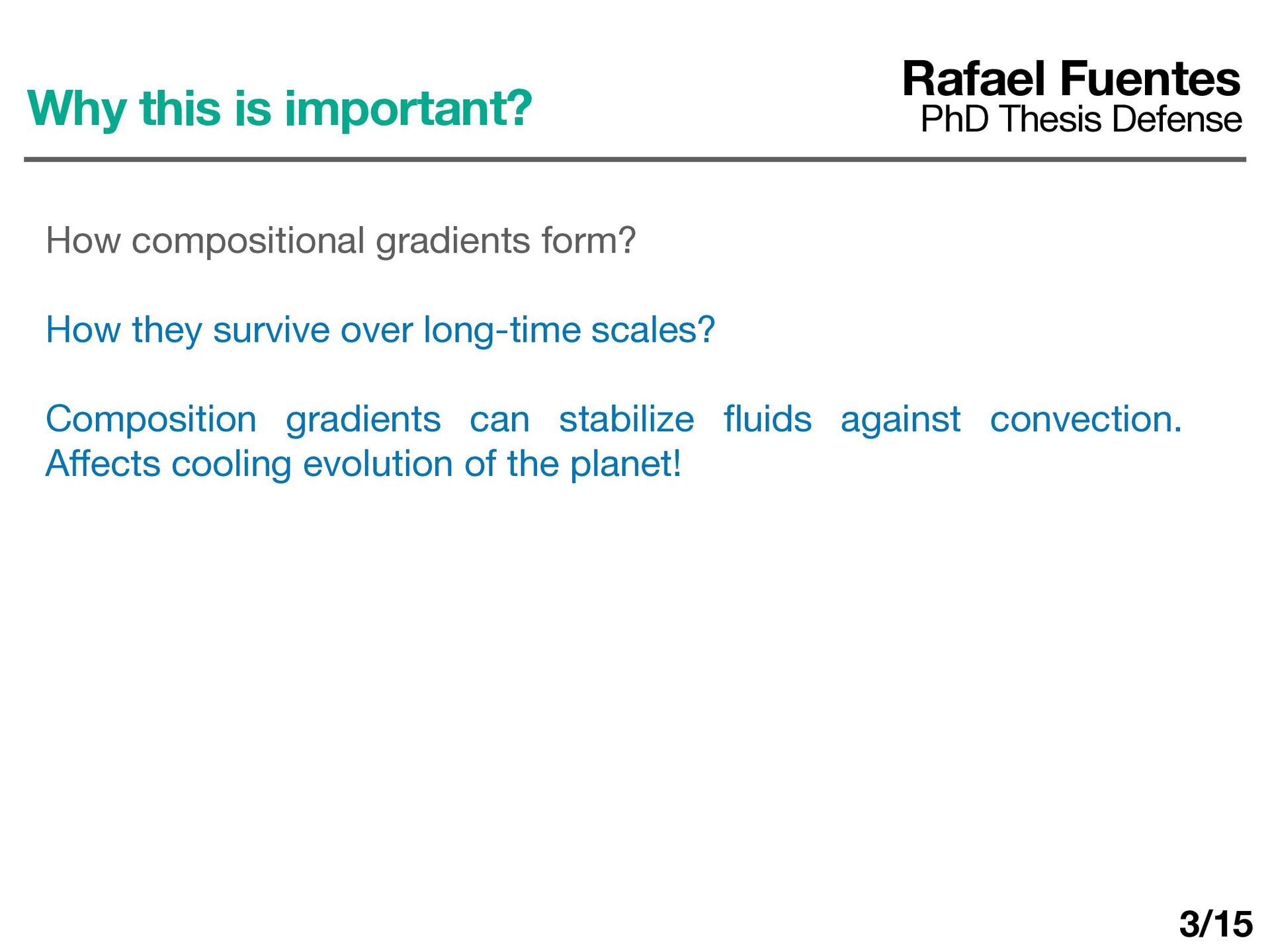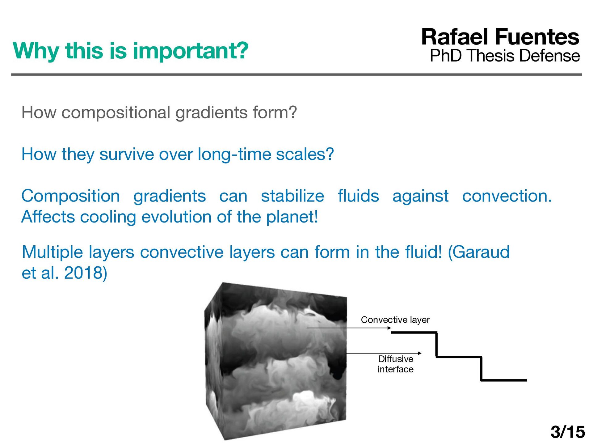 ln P > 0 Rafael Fuentes PhD Thesis Defense How compositional gradients form? How they survive over long-time scales? Composition gradients can stabilize fl uids against convection. A ff ects cooling evolution of the planet! 3/15 Di ff usive interface Convective layer Multiple layers convective layers can form in the fl uid! (Garaud et al. 2018)