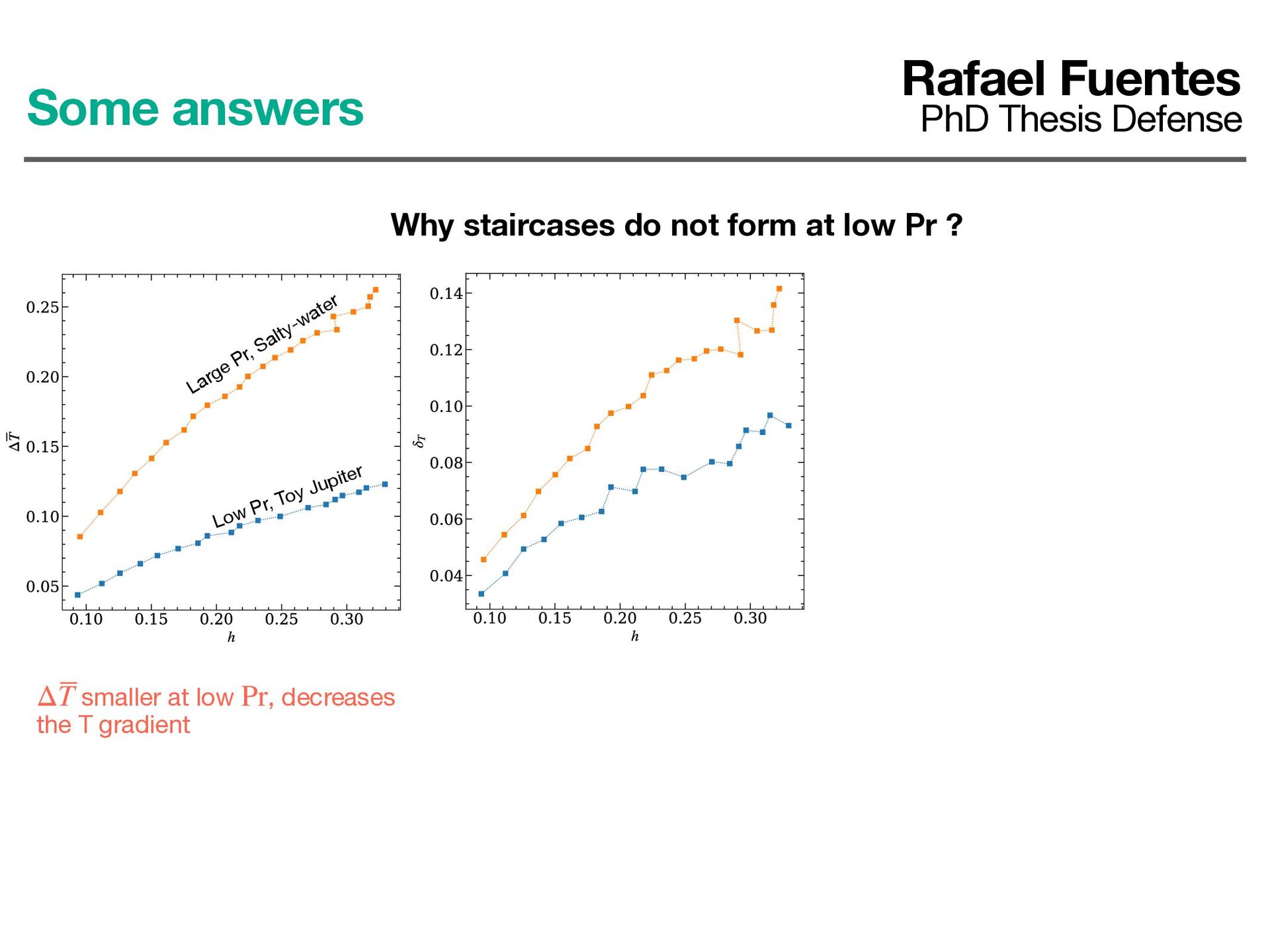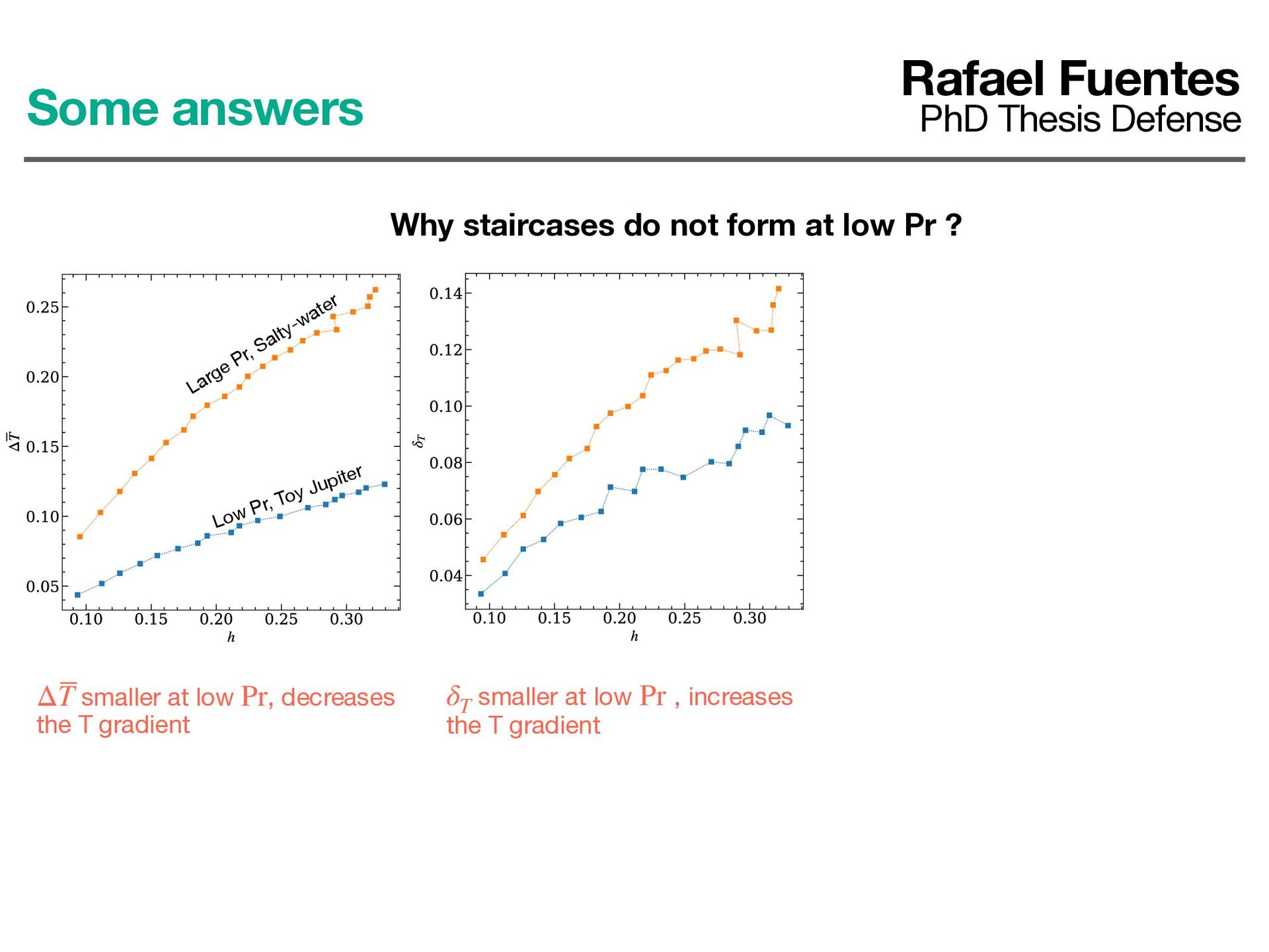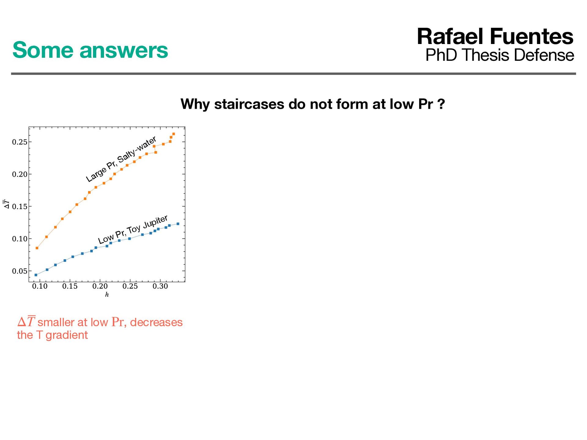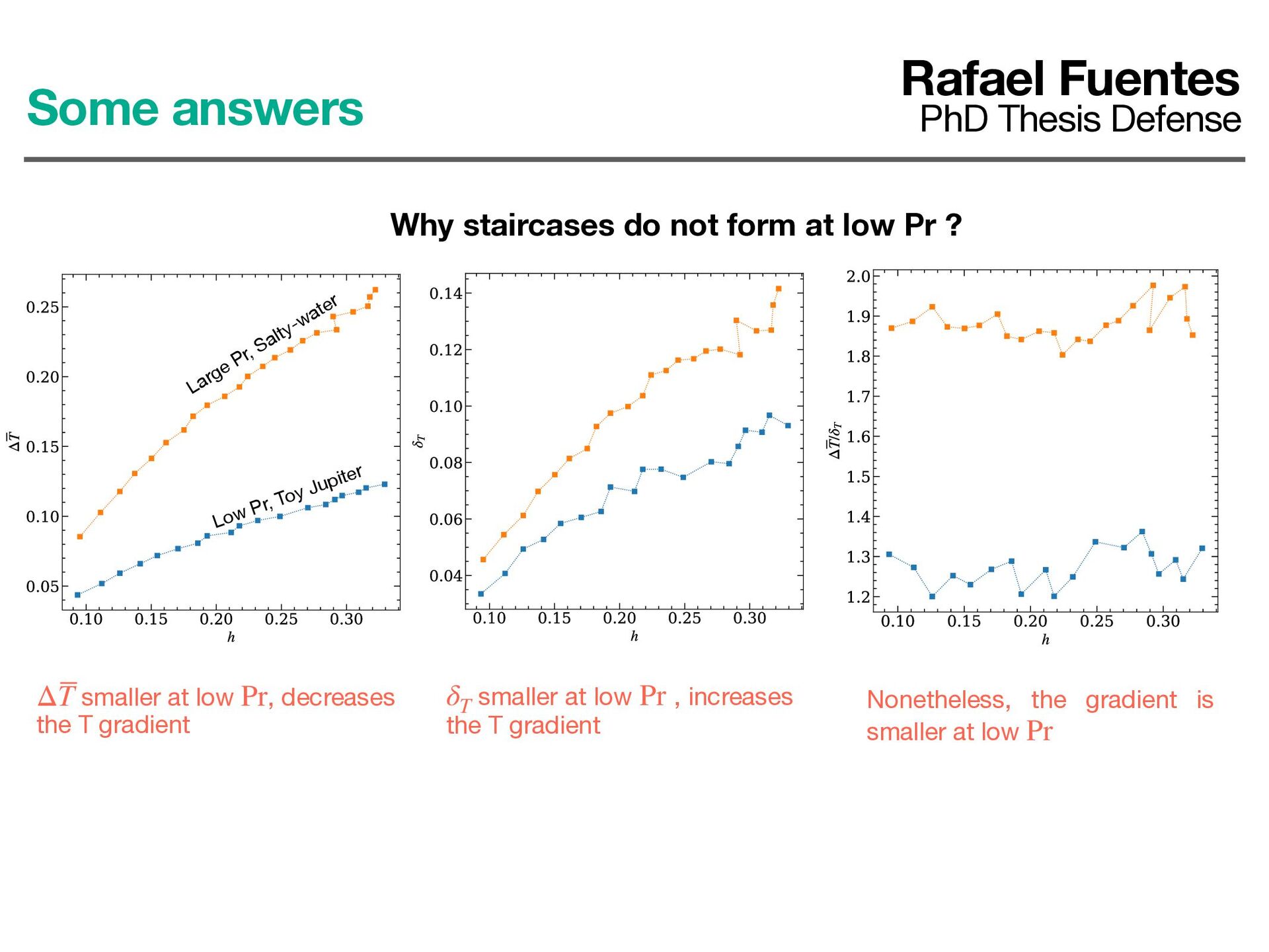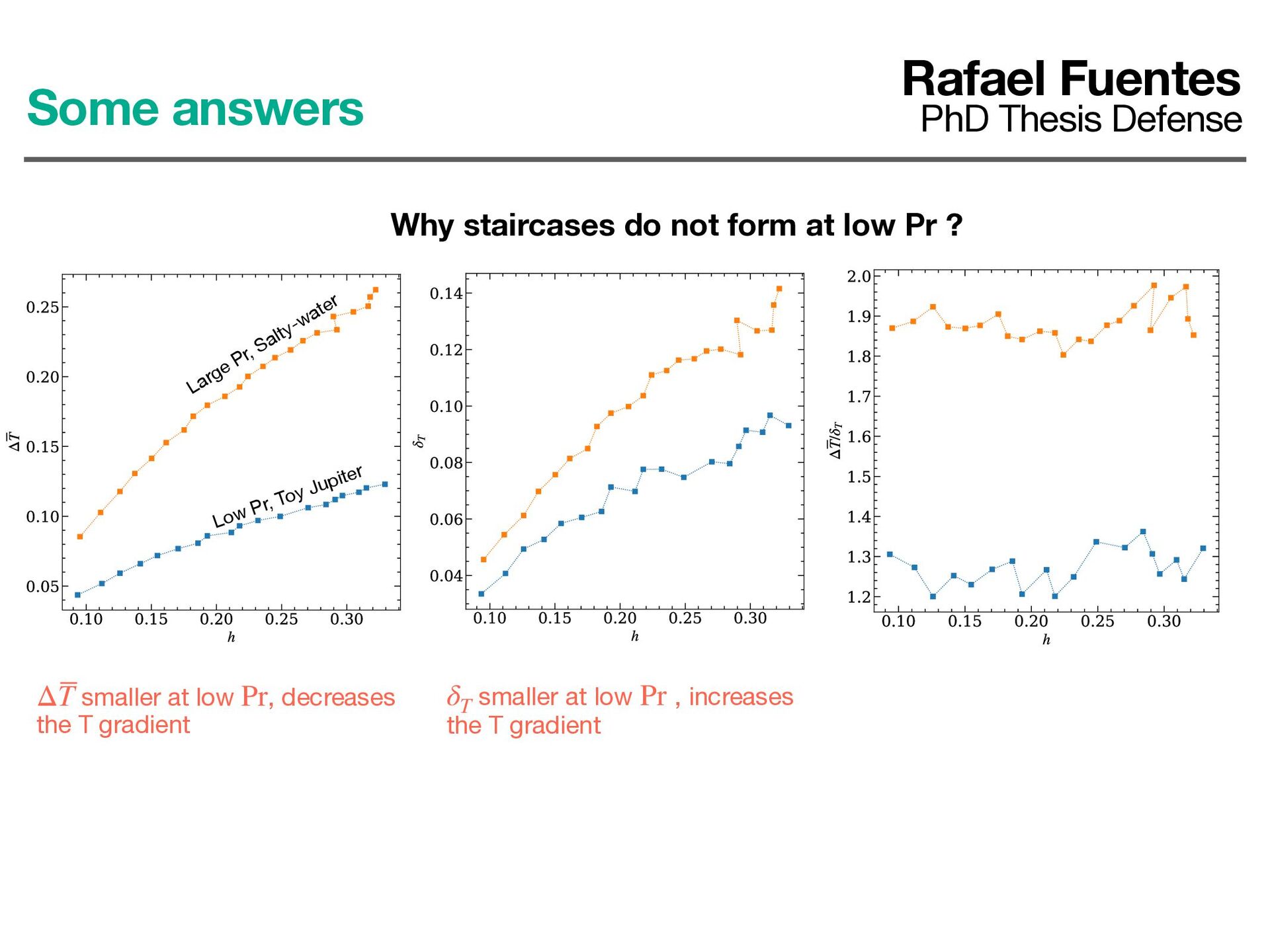 not form at low Pr ? smaller at low , decreases the T gradient ΔT Pr smaller at low , increases the T gradient δT Pr Large Pr, Salty-water Low Pr, Toy Jupiter Nonetheless, the gradient is smaller at low Pr