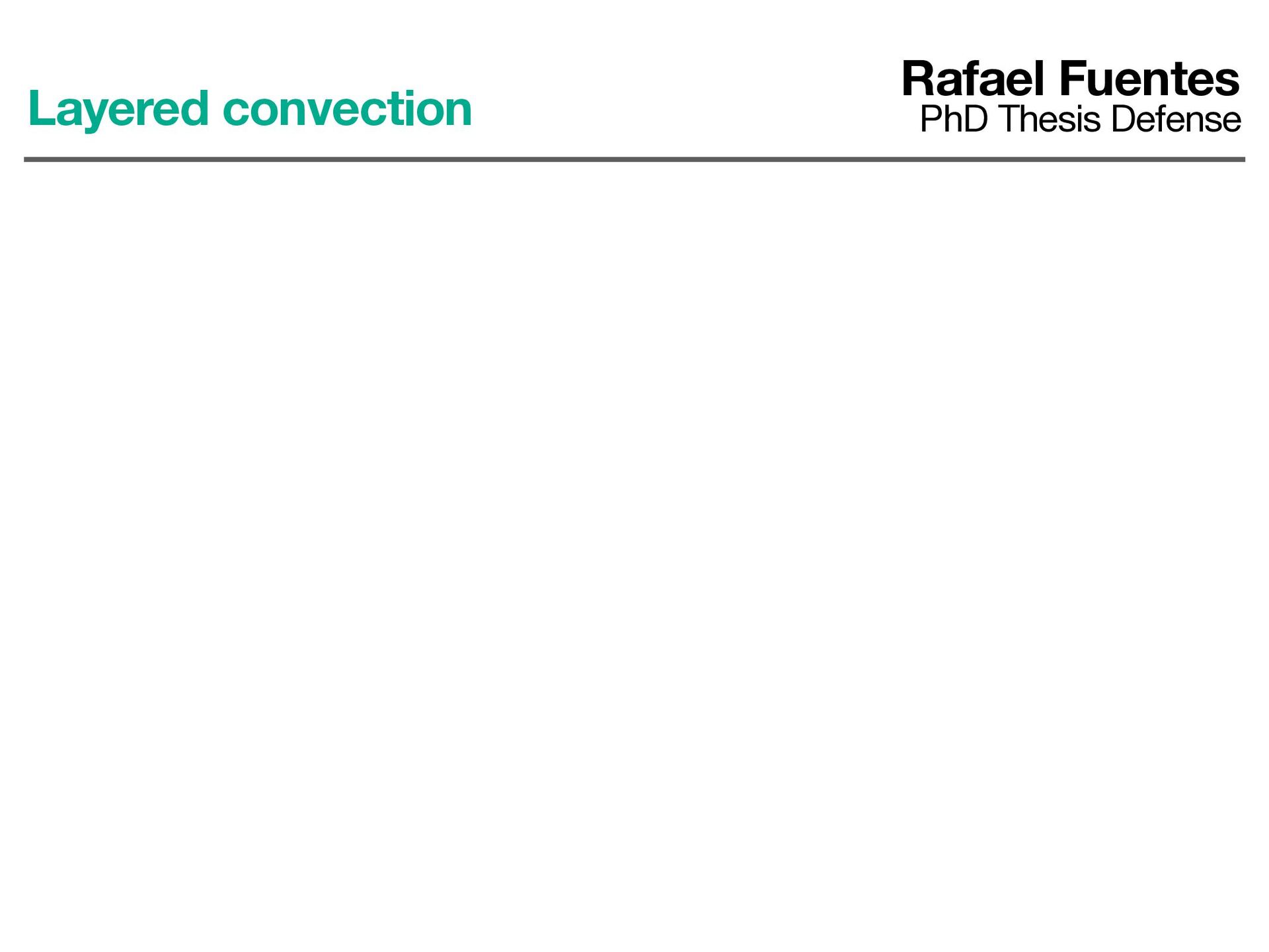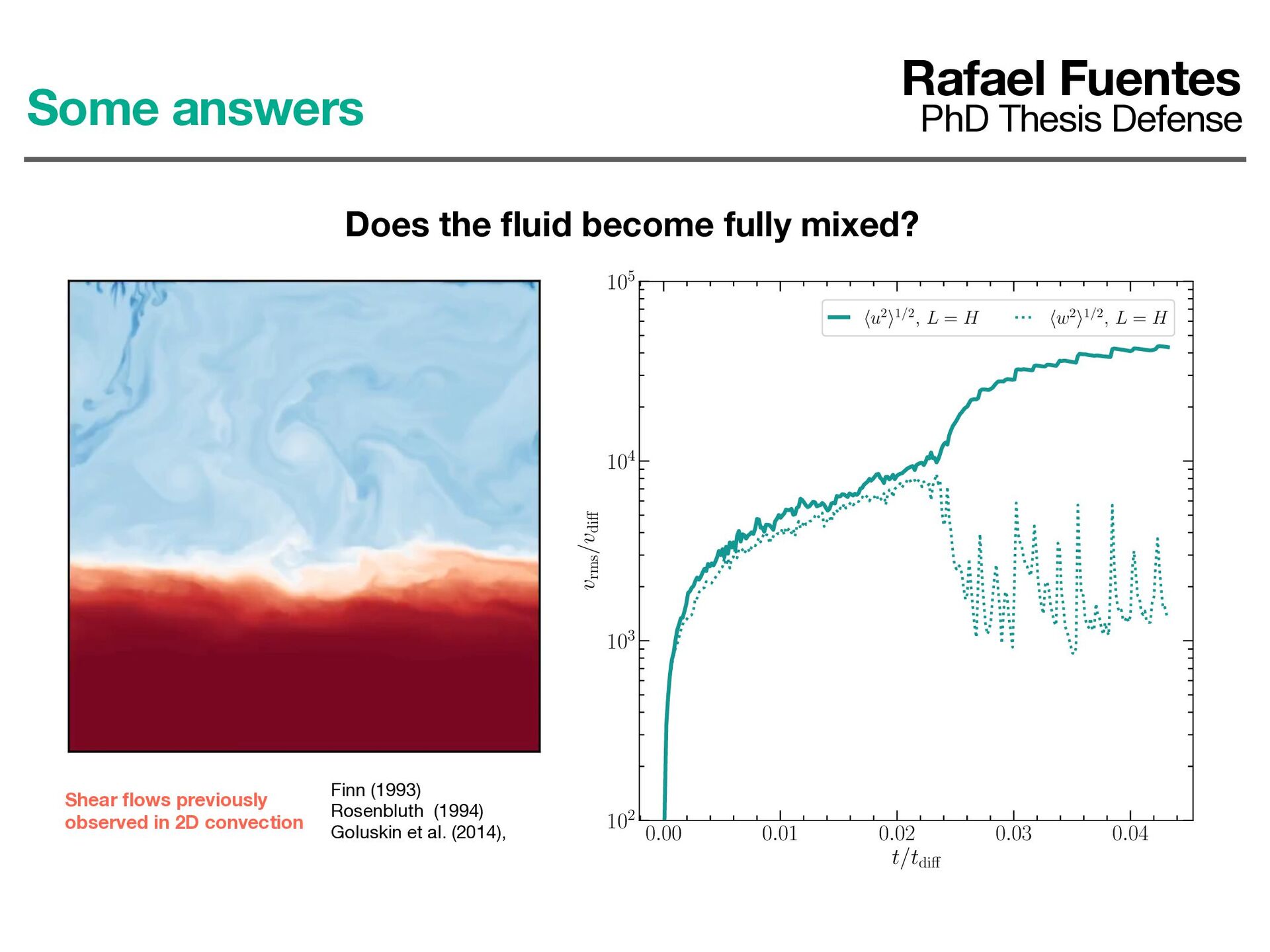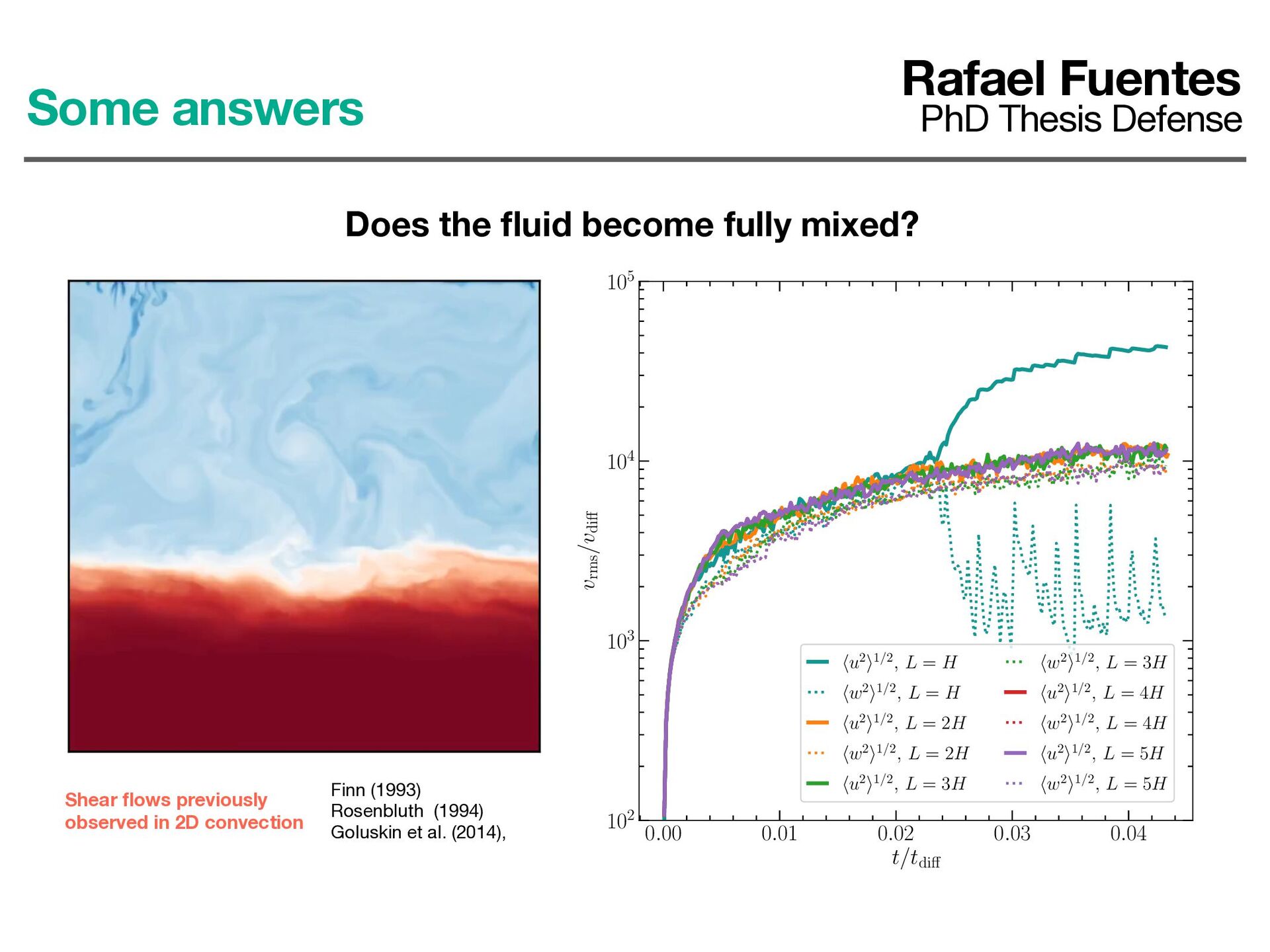 ows previously observed in 2D convection Some answers Rafael Fuentes PhD Thesis Defense Does the fl uid become fully mixed? 0.00 0.01 0.02 0.03 0.04 t/tdiÆ 102 103 104 105 vrms /vdiÆ hu2i1/2, L = H hw2i1/2, L = H 0.00 0.01 0.02 0.03 0.04 t/tdiÆ 102 103 104 105 vrms /vdiÆ hu2i1/2, L = H hw2i1/2, L = H hu2i1/2, L = 2H hw2i1/2, L = 2H hu2i1/2, L = 3H hw2i1/2, L = 3H hu2i1/2, L = 4H hw2i1/2, L = 4H hu2i1/2, L = 5H hw2i1/2, L = 5H