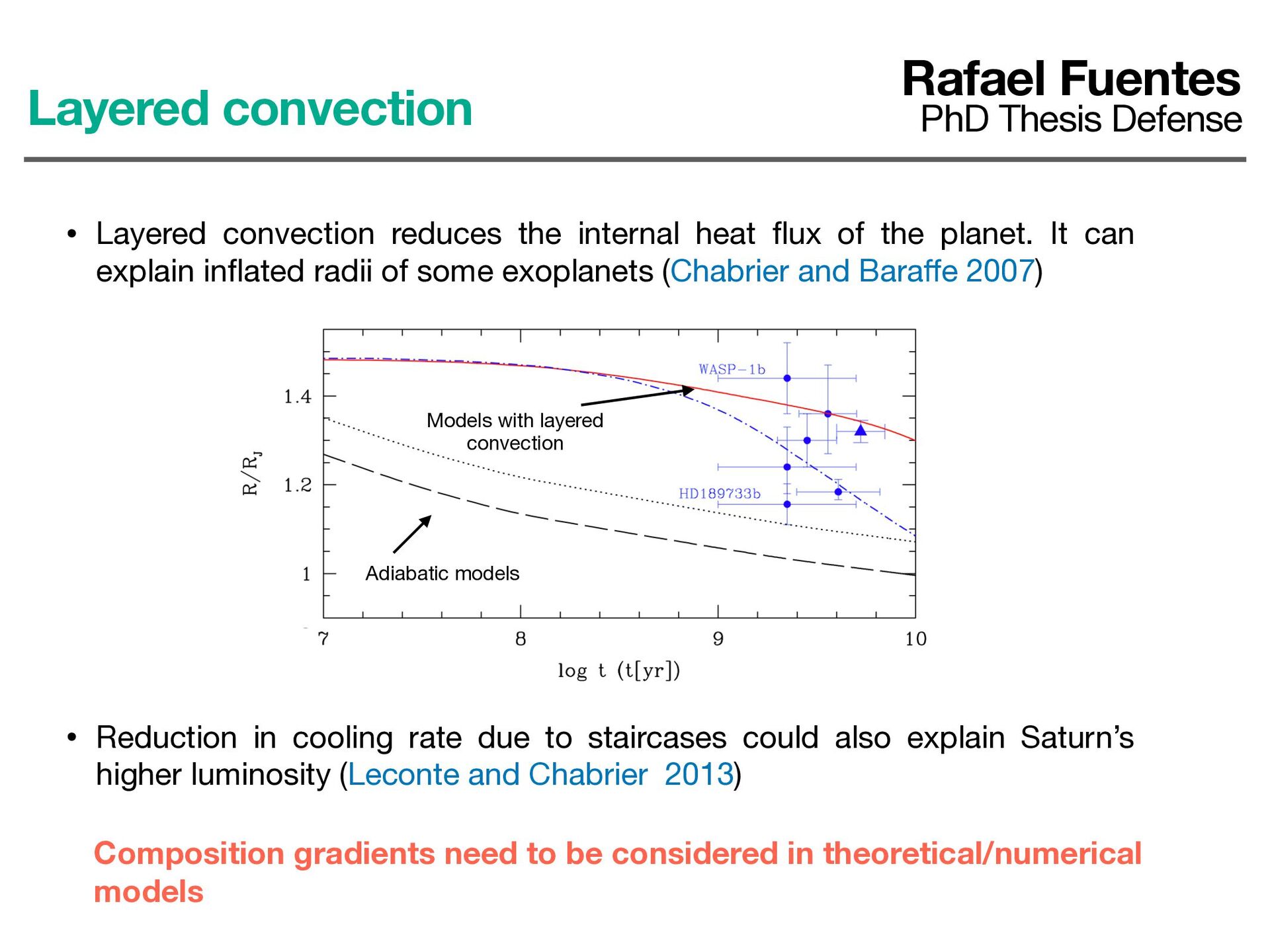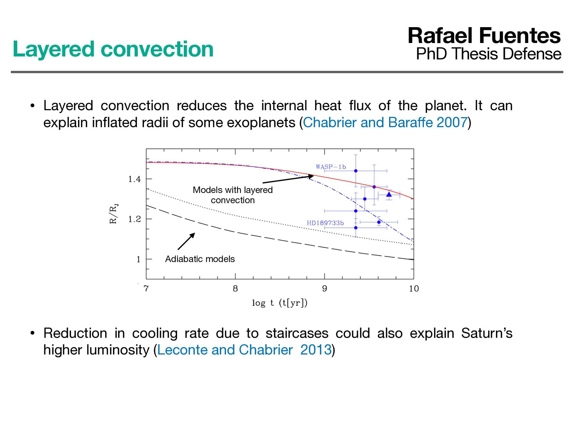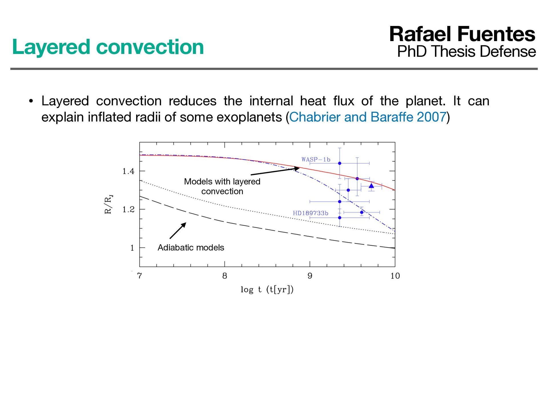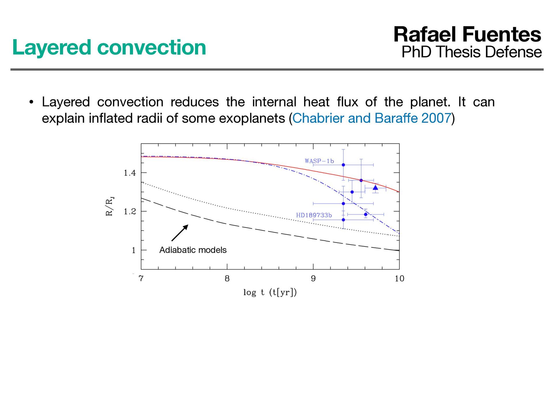 the planet. It can explain in fl ated radii of some exoplanets (Chabrier and Bara ff e 2007) Adiabatic models Layered convection Rafael Fuentes PhD Thesis Defense