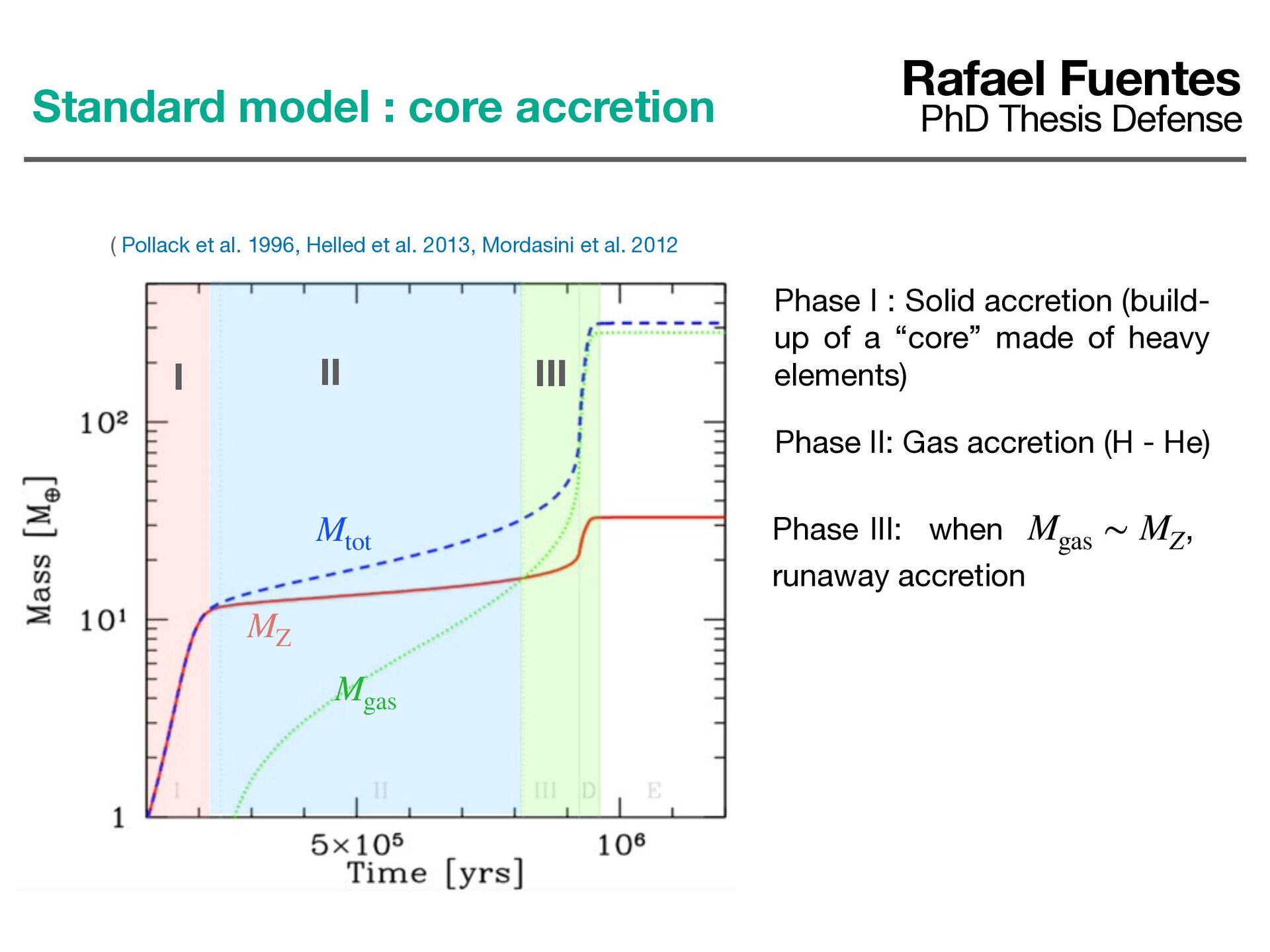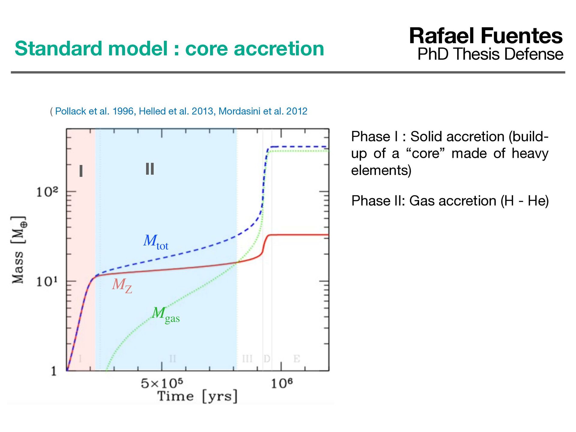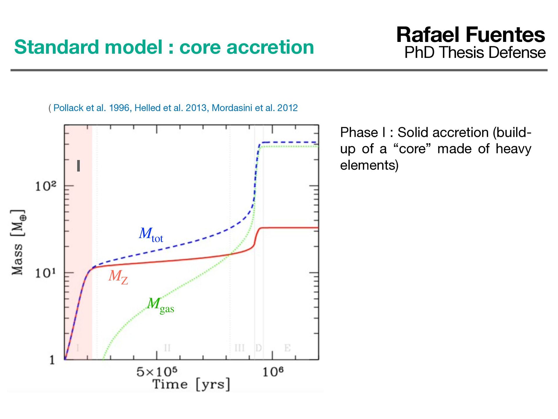 et al. 2012 Mgas MZ Mtot Phase I : Solid accretion (build- up of a “core” made of heavy elements) I Rafael Fuentes PhD Thesis Defense Standard model : core accretion