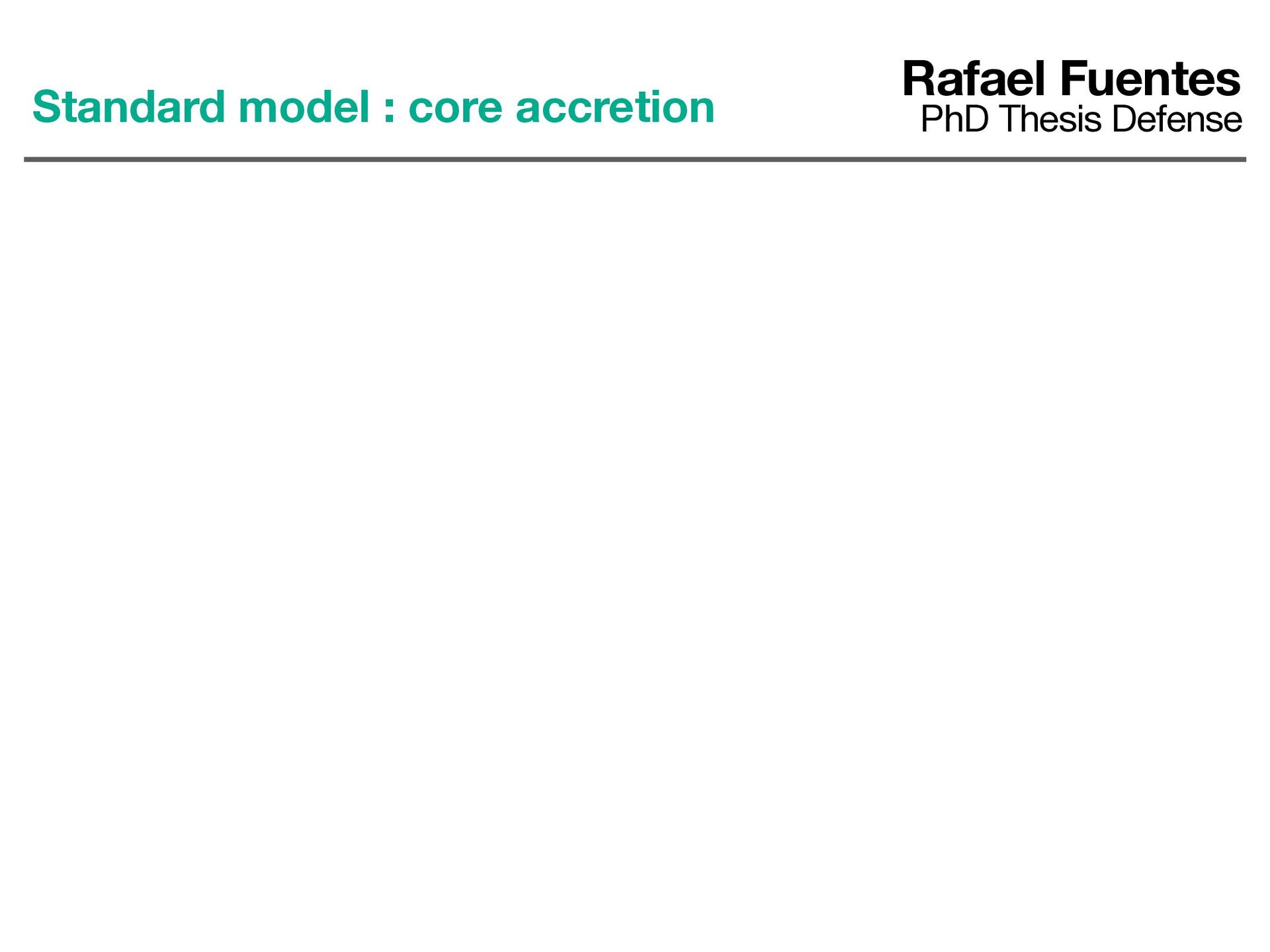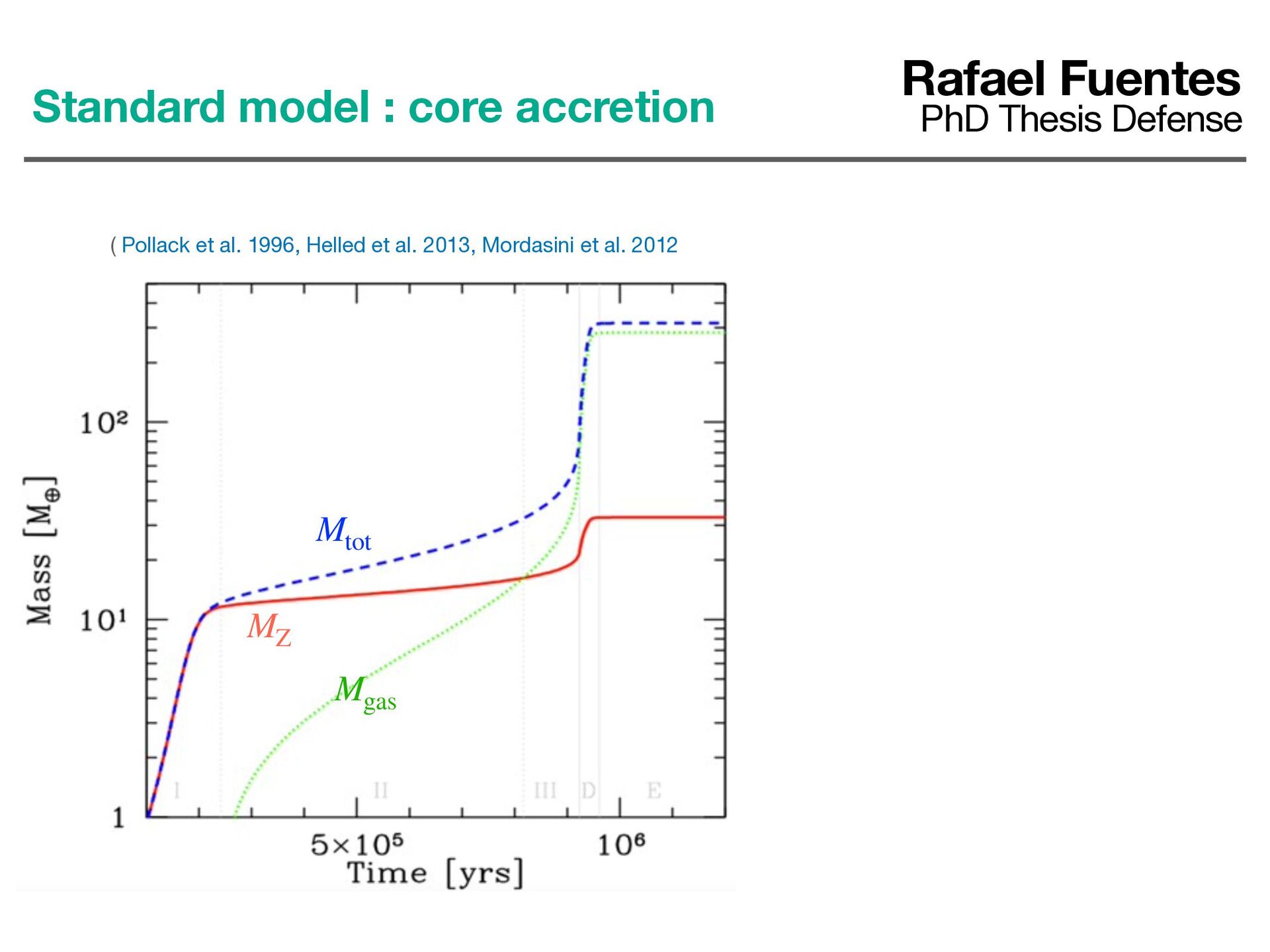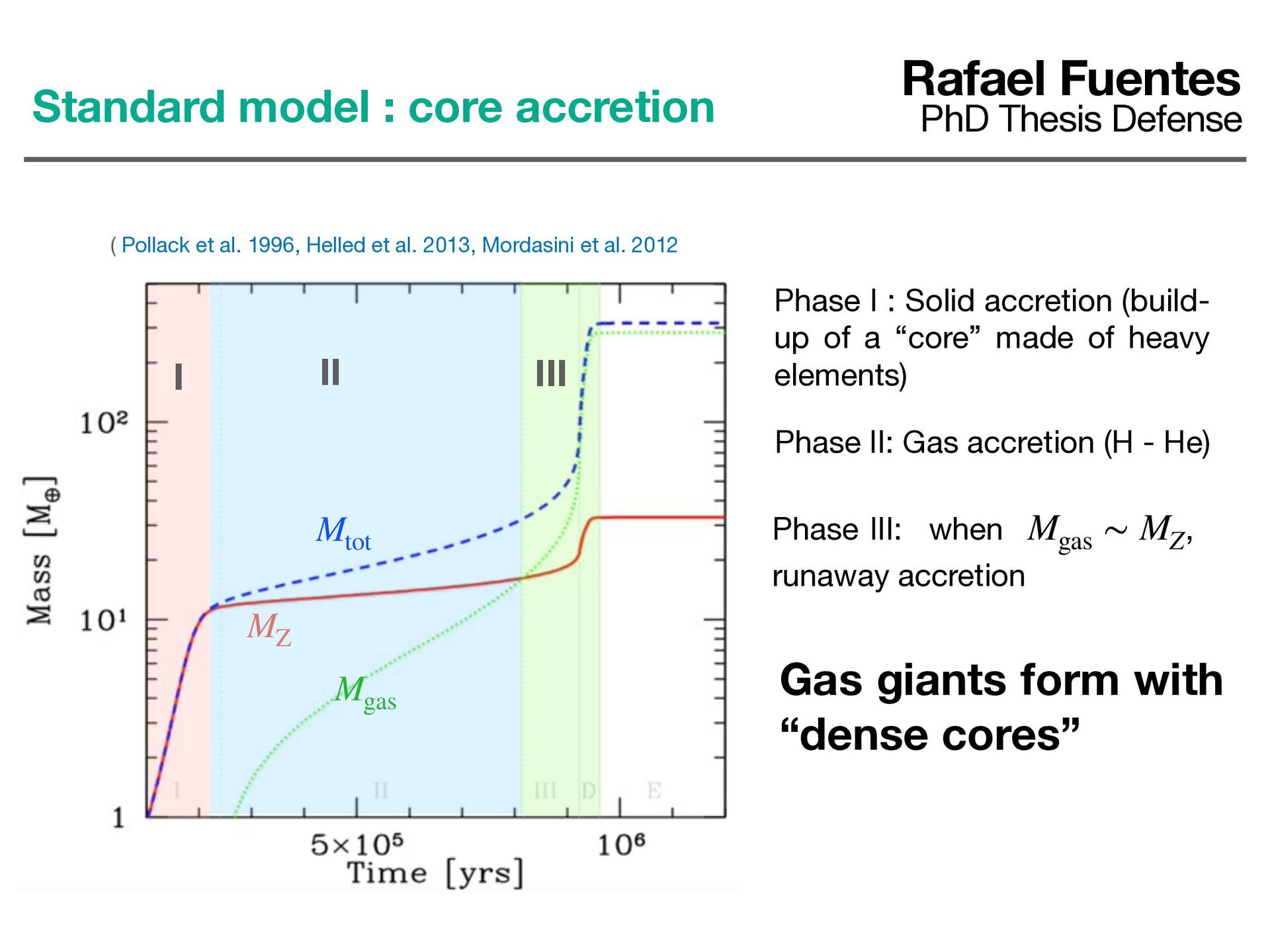 et al. 2012 Mgas MZ Mtot Phase I : Solid accretion (build- up of a “core” made of heavy elements) I Rafael Fuentes PhD Thesis Defense Standard model : core accretion