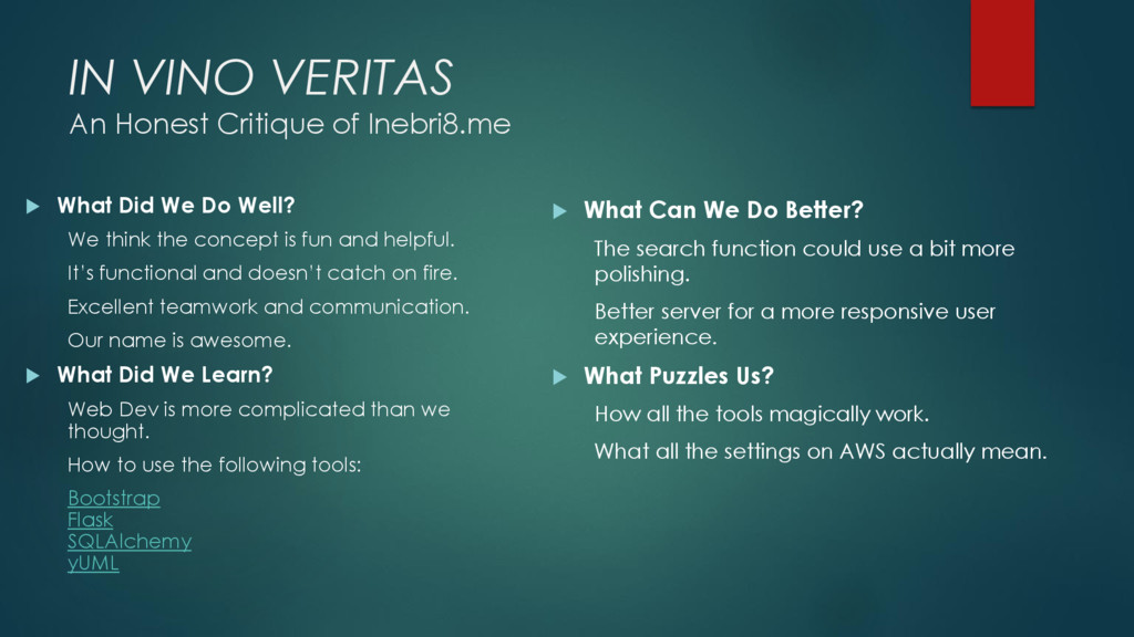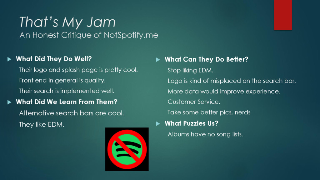 Did They Do Well? Their logo and splash page is pretty cool. Front end in general is quality. Their search is implemented well. What Did We Learn From Them? Alternative search bars are cool. They like EDM. What Can They Do Better? Stop liking EDM. Logo is kind of misplaced on the search bar. More data would improve experience. Customer Service. Take some better pics, nerds What Puzzles Us? Albums have no song lists.