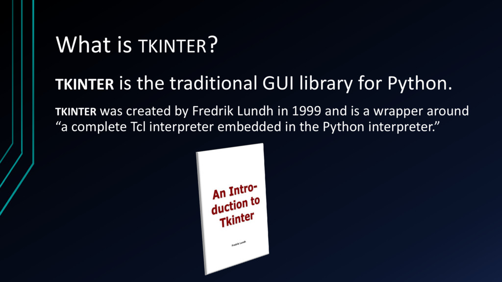 Python. TKINTER was created by Fredrik Lundh in 1999 and is a wrapper around “a complete Tcl interpreter embedded in the Python interpreter.”