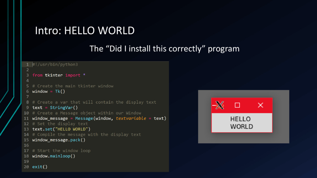 Intro: HELLO WORLD The “Did I install this correctly” program