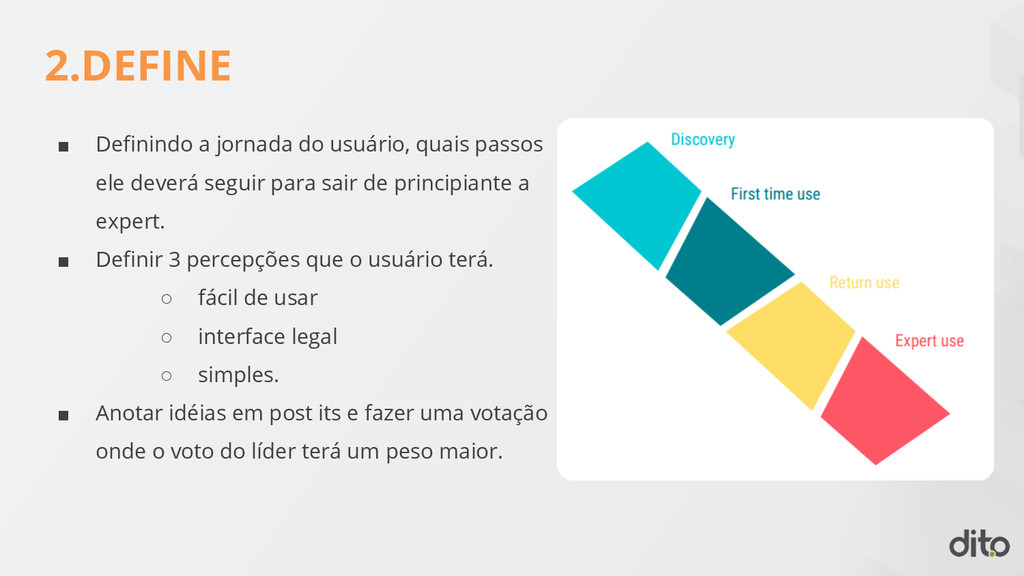 deverá seguir para sair de principiante a expert. ▪ Definir 3 percepções que o usuário terá. ◦ fácil de usar ◦ interface legal ◦ simples. ▪ Anotar idéias em post its e fazer uma votação onde o voto do líder terá um peso maior.