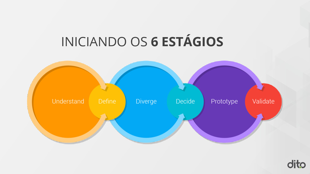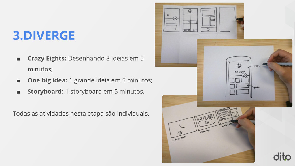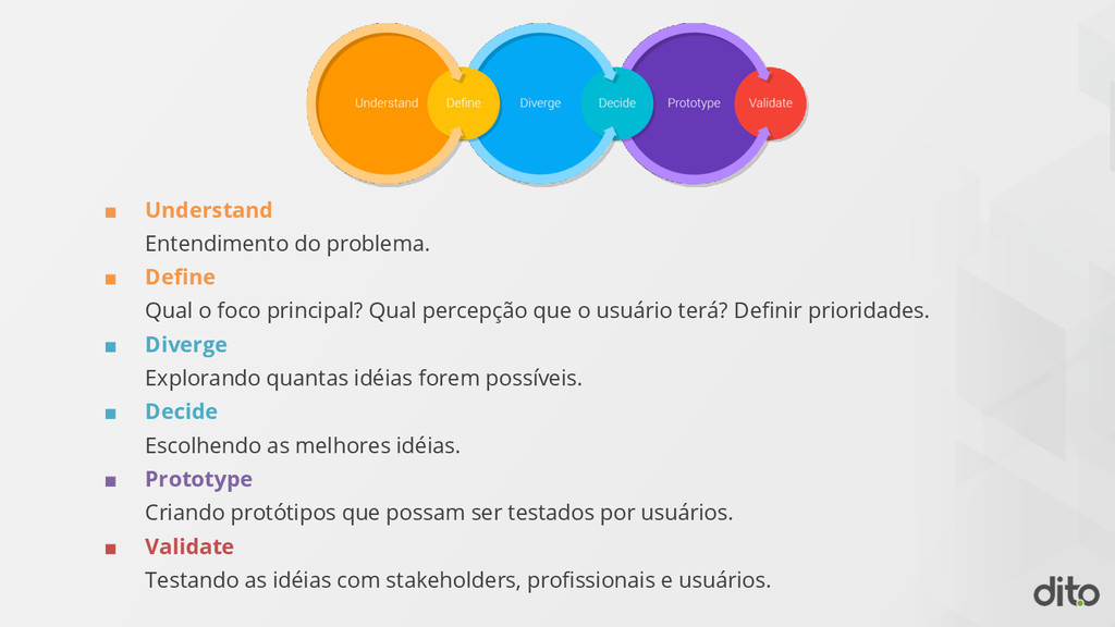 principal? Qual percepção que o usuário terá? Definir prioridades. ▪ Diverge Explorando quantas idéias forem possíveis. ▪ Decide Escolhendo as melhores idéias. ▪ Prototype Criando protótipos que possam ser testados por usuários. ▪ Validate Testando as idéias com stakeholders, profissionais e usuários.