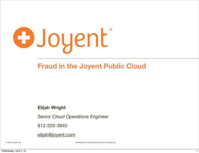 Inc. . Don’t be a soft target. •When fraudsters have web pages teaching each other how to exploit your weak business process.... •You are totally fucked. •This happened to us - “how to run a seedbox on Joyent” - a few years ago when we were much smaller. •Solution - improve business process. A lot. 9 Wednesday, April 3, 13