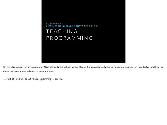 O G R A M M I N G E L I Z A B R O C K I N S T R U C T O R , N A S H V I L L E S O F T WA R E S C H O O L Hi! I’m Eliza Brock. I’m an instructor at Nashville Software School, where I teach the advanced software development course. I’m here today to talk to you about my experiences in teaching programming. ! To start off, let’s talk about what programming is, exactly.