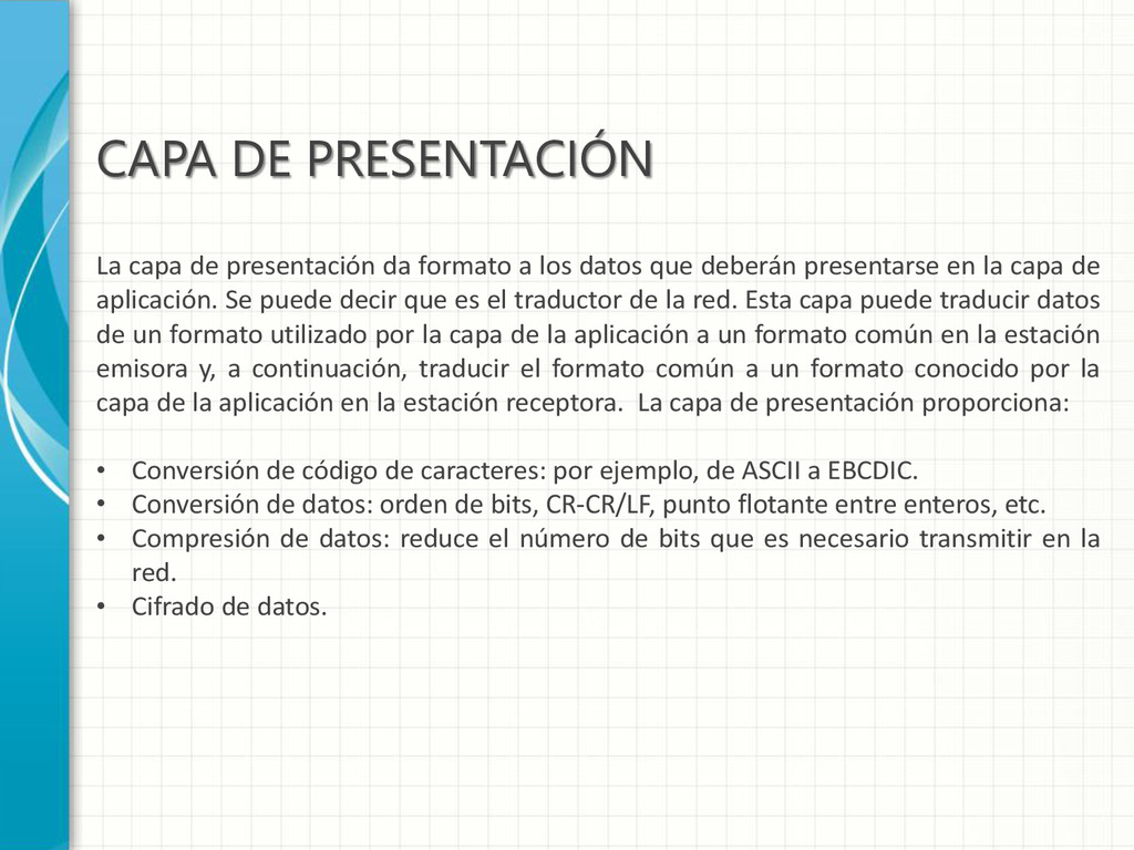 de sesiones entre procesos que se ejecutan en diferentes estaciones. Proporciona: • Establecimiento, mantenimiento y finalización de sesiones: permite que dos procesos de aplicación en diferentes equipos establezcan, utilicen y finalicen una conexión, que se denomina sesión. • Soporte de sesión: realiza las funciones que permiten a estos procesos comunicarse a través de una red, ejecutando la seguridad, el reconocimiento de nombres, el registro, etc.