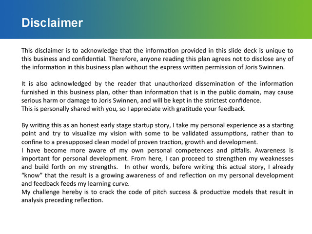 this slide deck is unique to this business and confiden4al. Therefore, anyone reading this plan agrees not to disclose any of the informa4on in this business plan without the express wri?en permission of Joris Swinnen. It is also acknowledged by the reader that unauthorized dissemina4on of the informa4on furnished in this business plan, other than informa4on that is in the public domain, may cause serious harm or damage to Joris Swinnen, and will be kept in the strictest confidence. This is personally shared with you, so I appreciate with gra4tude your feedback. By wri4ng this as an honest early stage startup story, I take my personal experience as a star4ng point and try to visualize my vision with some to be validated assump4ons, rather than to confine to a presupposed clean model of proven trac4on, growth and development. I have become more aware of my own personal competences and piEalls. Awareness is important for personal development. From here, I can proceed to strengthen my weaknesses and build forth on my strengths. In other words, before wri4ng this actual story, I already “know” that the result is a growing awareness of and reflec4on on my personal development and feedback feeds my learning curve. My challenge hereby is to crack the code of pitch success & produc4ze models that result in analysis preceding reflec4on. Disclaimer