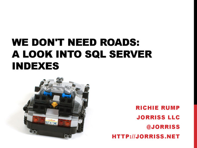 Have you ever ran a SQL against SQL Server and it was so slow that you wondered if the database was from 1955? You could use a Delorean or you can create indexes in your database. This session will introduce you to SQL Server indexes. Indexes are a powerful tool to improve the performance of our queries. We'll discuss how indexes are structured and why they speed up queries, how INSERT, UPDATE, and DELETE queries are affected by indexes and how to identify if an index is necessary. Then, we'll take a look at an Entity Framework application and see how EF reacts to our fresh new indexes. If you want to make bad query performance a thing of the past this session is for you.