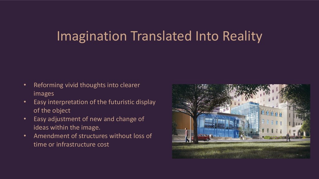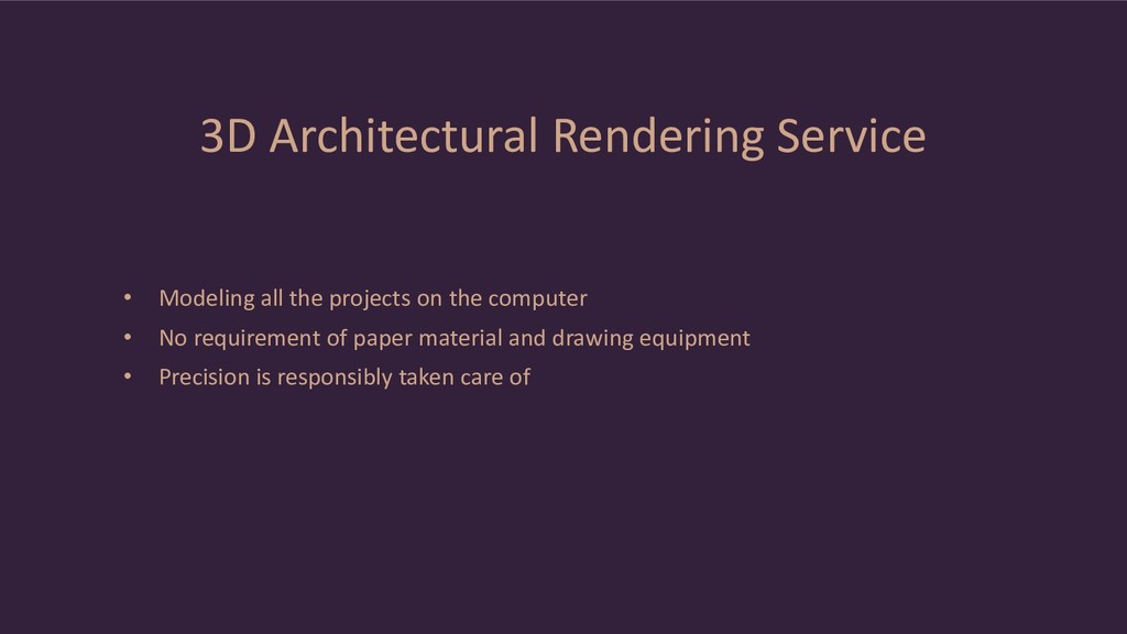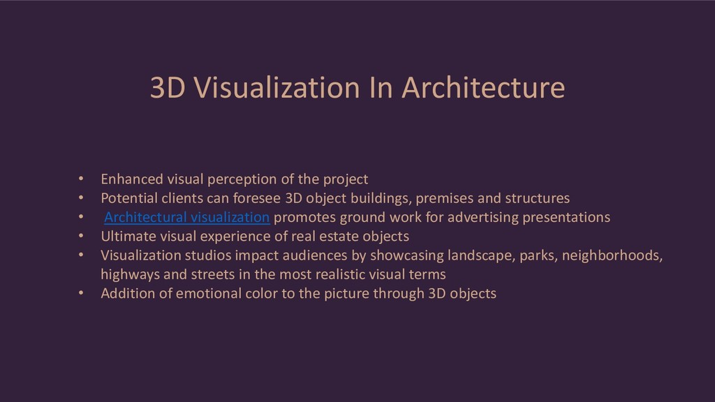 project • Potential clients can foresee 3D object buildings, premises and structures • Architectural visualization promotes ground work for advertising presentations • Ultimate visual experience of real estate objects • Visualization studios impact audiences by showcasing landscape, parks, neighborhoods, highways and streets in the most realistic visual terms • Addition of emotional color to the picture through 3D objects