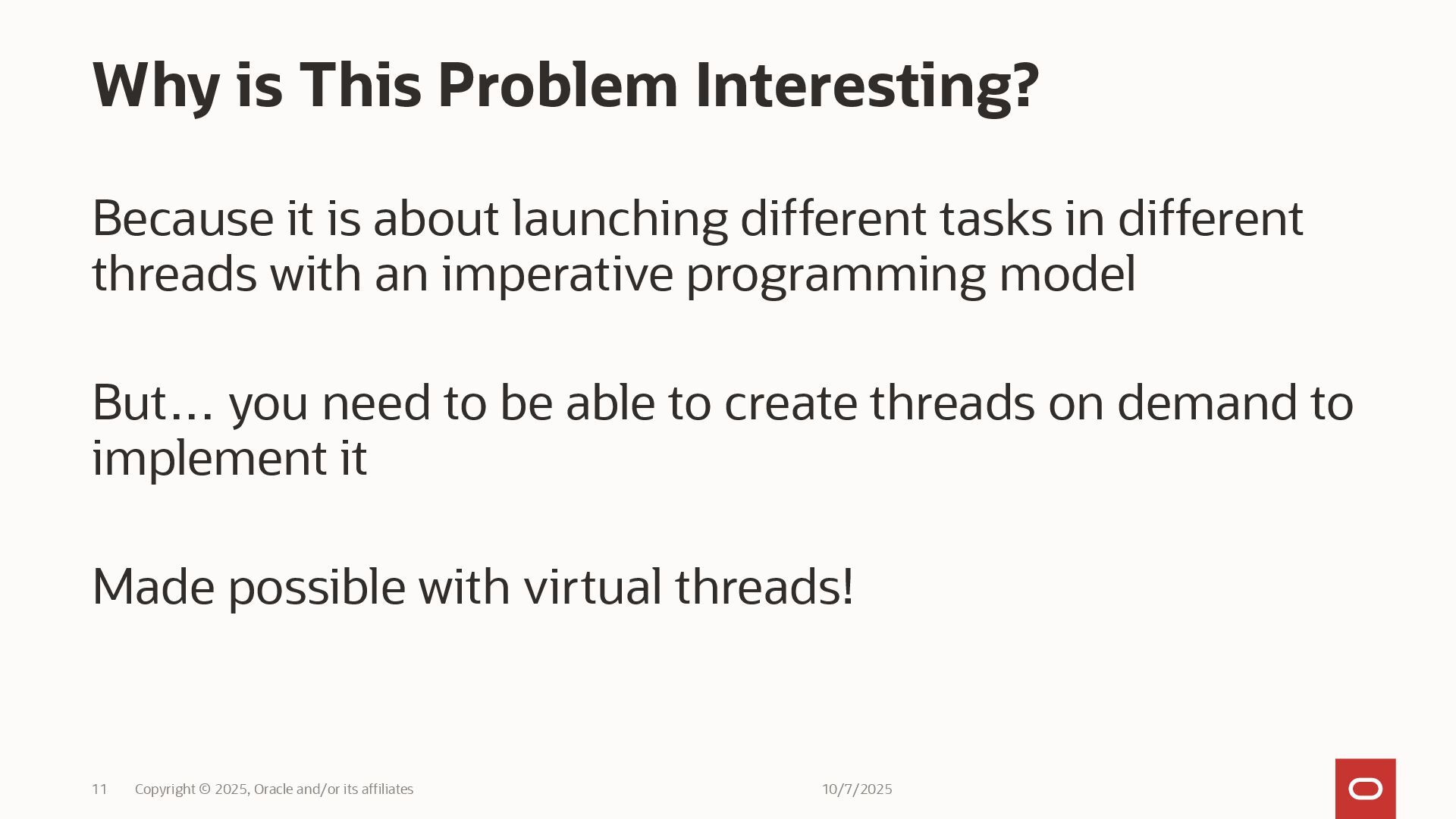 One of the most exciting features delivered by JDK 21 are Virtual Threads, developed by the Loom project. They promise to enable the "simple thread-per-request style to scale with near-optimal hardware utilization". Before Virtual Threads, this could only be achieved with reactive programming, which provides excellent throughput, but with patterns that are difficult to write, read, debug, and profile. It offers outstanding performance, but at the expense of maintainability. This hands-on lab guides you through writing a virtual thread-based application that utilizes structured concurrency to parallelize requests and scoped values to pass sensitive information without relying on method parameters. You will see the patterns of code that the Loom project gives you to achieve the same throughput as a classical reactive application. You will then be able to compare the code patterns of both approaches to choose which one you prefer.