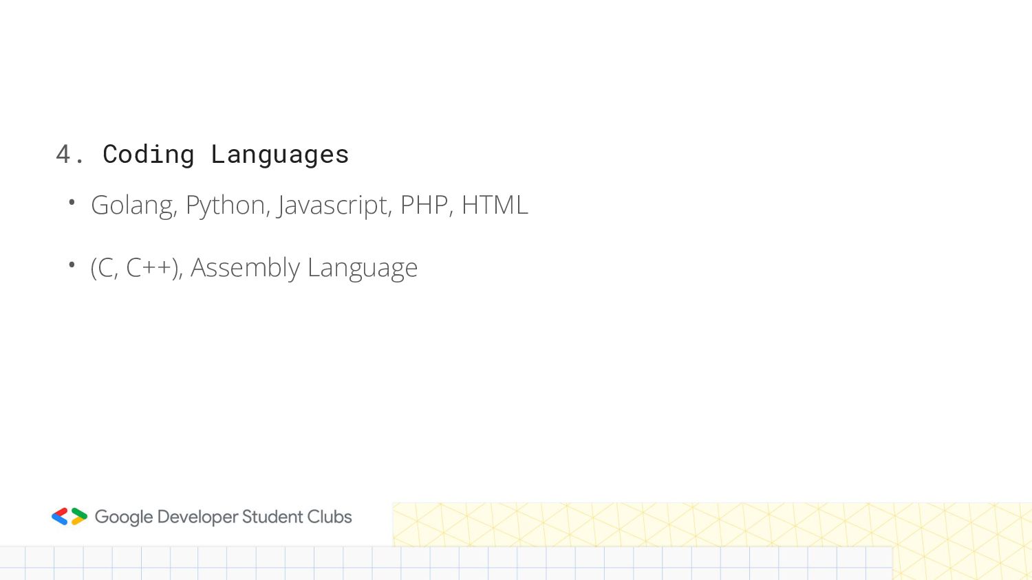 • Golang, Python, Javascript, PHP, HTML • (C, C++), Assembly