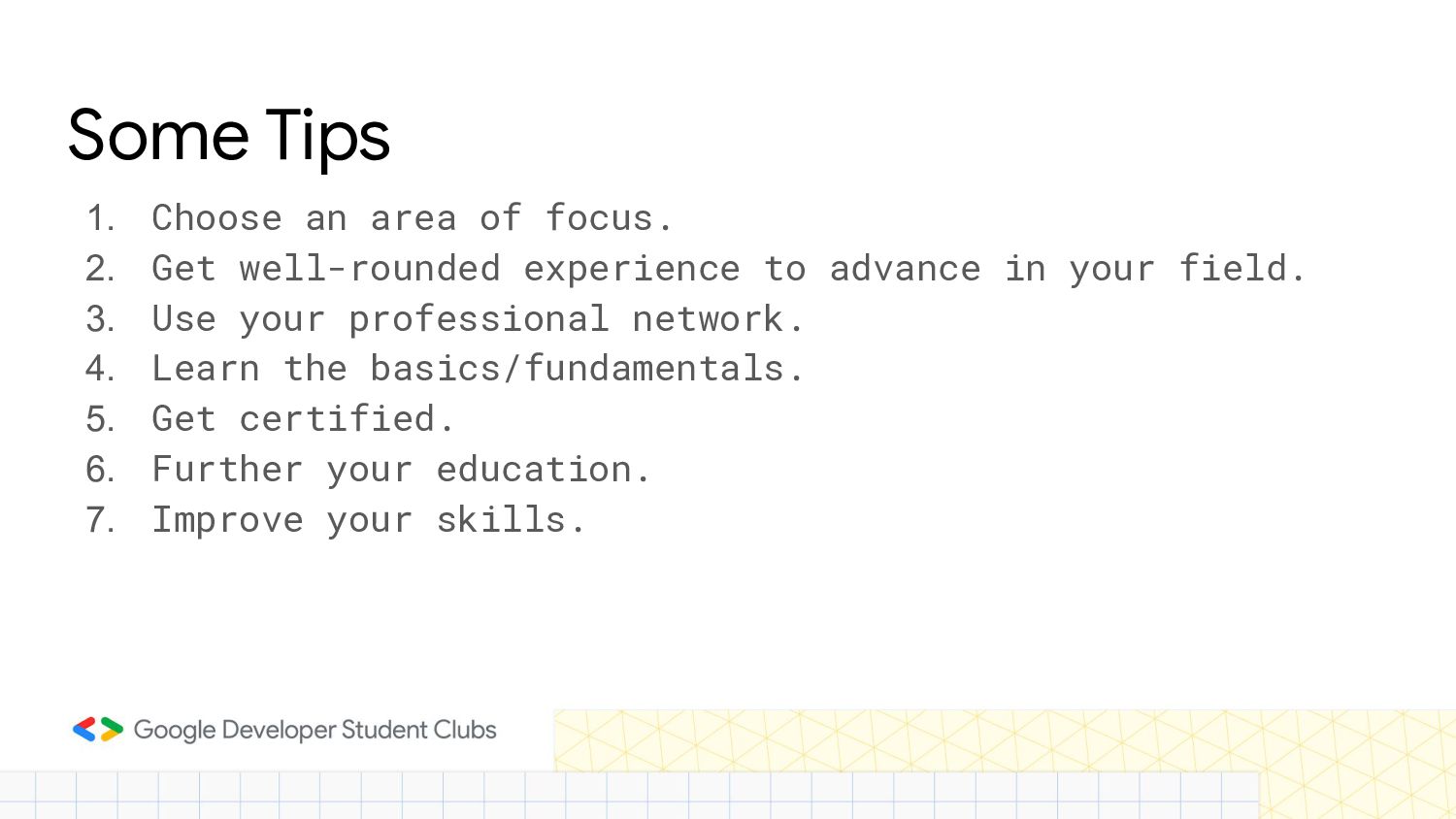 well-rounded experience to advance in your field. 3. Use your professional network. 4. Learn the basics/fundamentals. 5. Get certified. 6. Further your education. 7. Improve your skills.